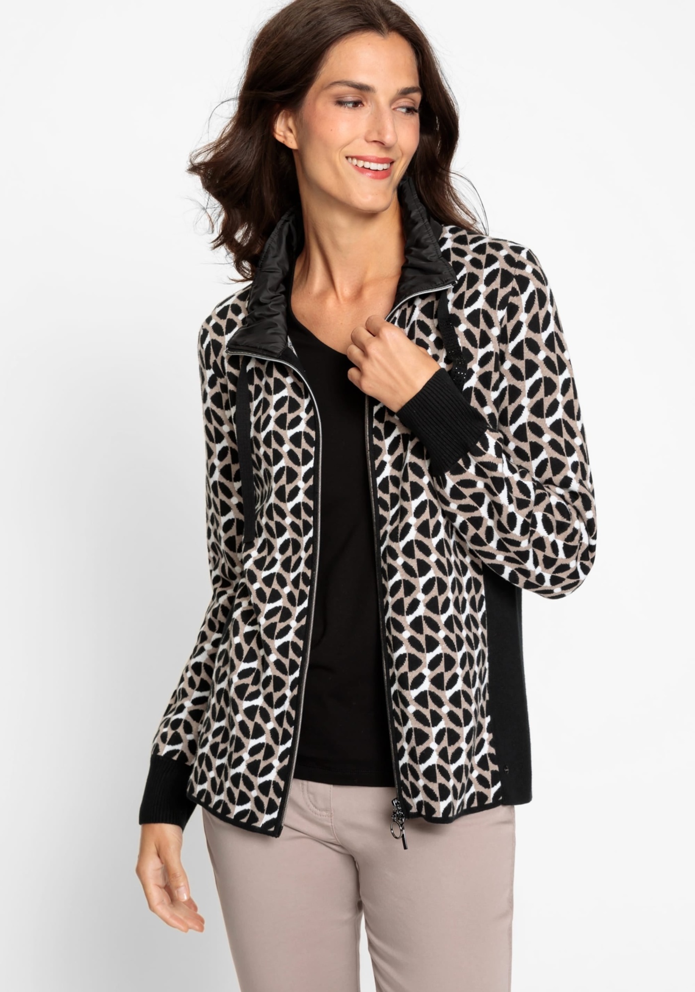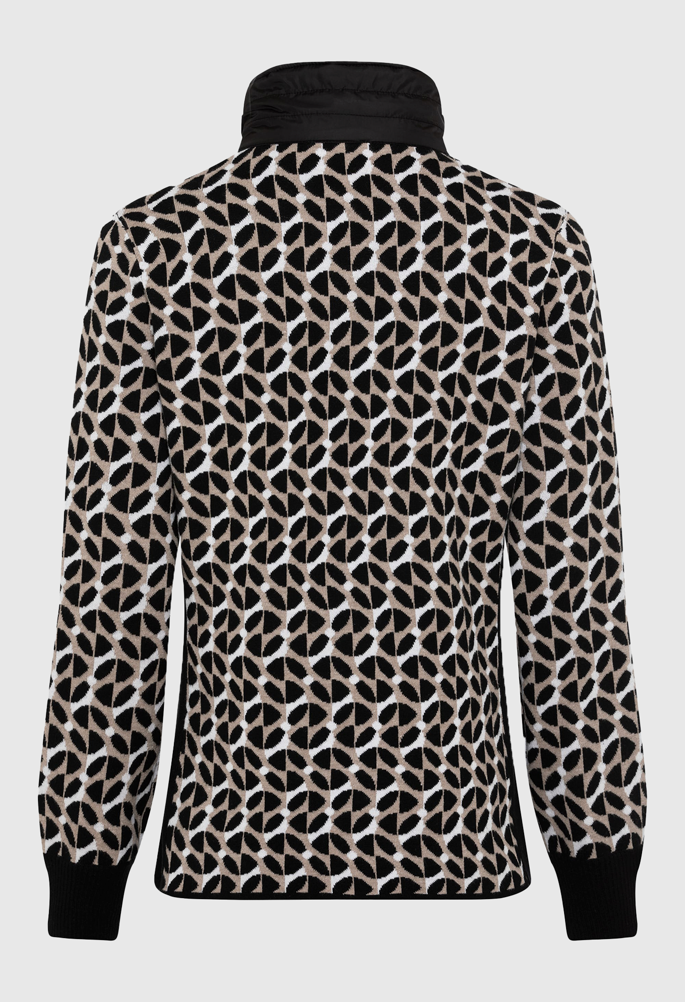 Трендовый геометрический узор по всей поверхности делает яркий акцент в этом спортивном стиле. Сочетание материалов: контрастный нейлоновый воротник в спортивном стиле дополнен стильной, но функциональной кулиской, украшенной стразами. Сплошные черные боковые панели создают иллюзию стройности фигуры. Высокое содержание хлопка для комфорта и воздухопроницаемости, двойная застежка-молния. Облегающий крой плотно прилегает к телу.