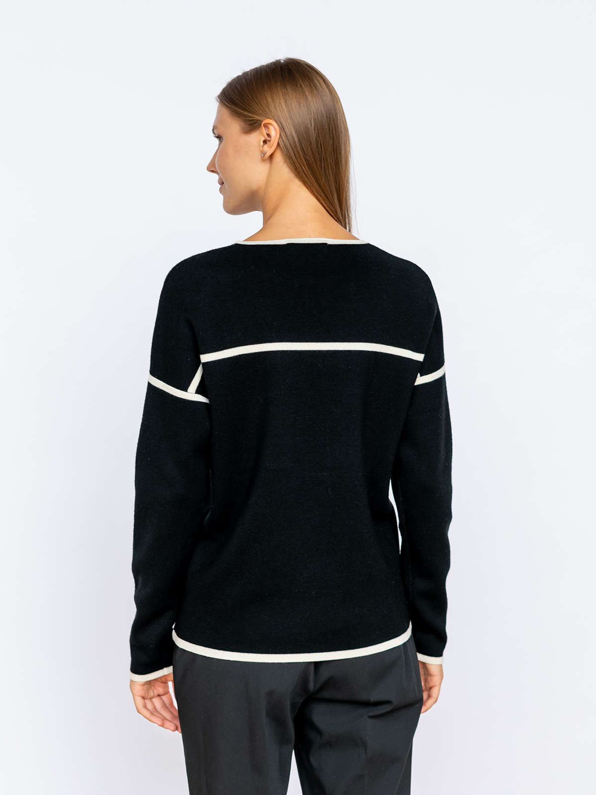Однотонный джемпер с контрастными линиями – оригинальный дизайн для образов в стиле кэжуал. Вырез горловины лодочка, длинный втачной рукав, спущенная линия плеч. Накладной карман на груди. Джемпер из 100% шерсти приятен к телу и хорошо сохраняет тепло. Предпочтительно носить навыпуск с джинсами, брюками или юбкой длиной миди.