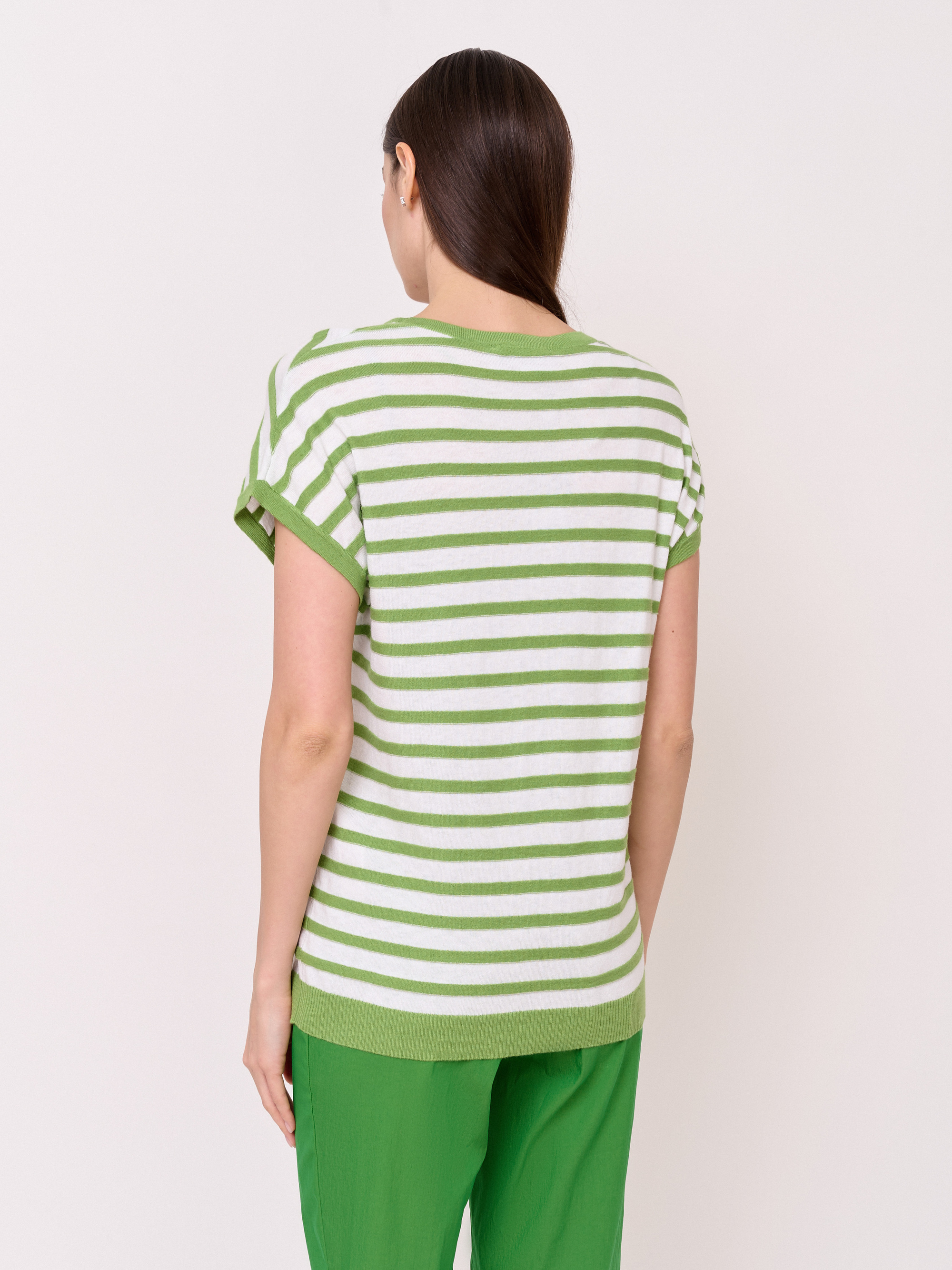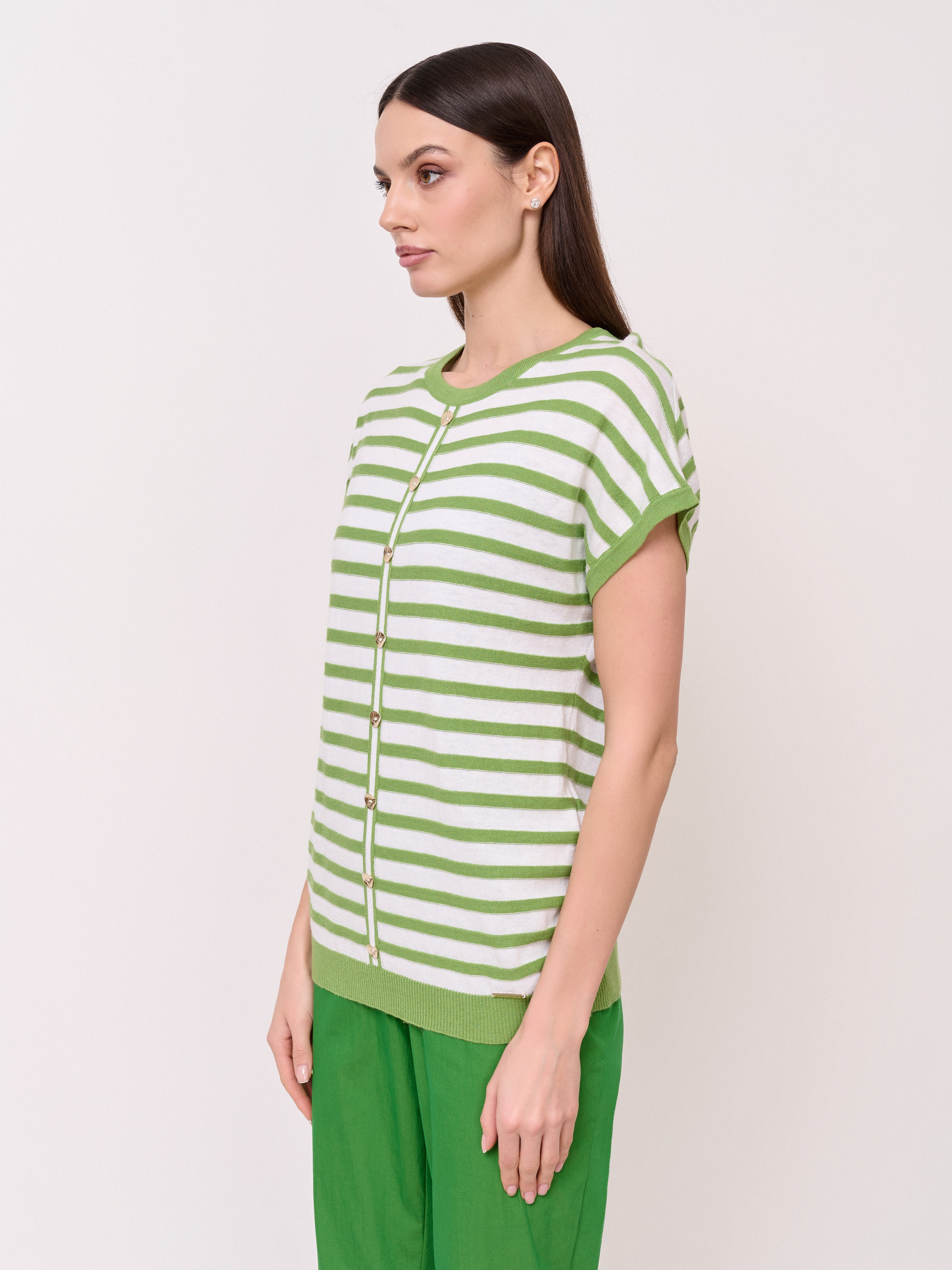 Детали: вырез горловины округлый, рукава короткие цельнокроеные, покрой прямой, рисунок полоска, декор в виде пуговиц по центру. Длина по спинке: 63 см.