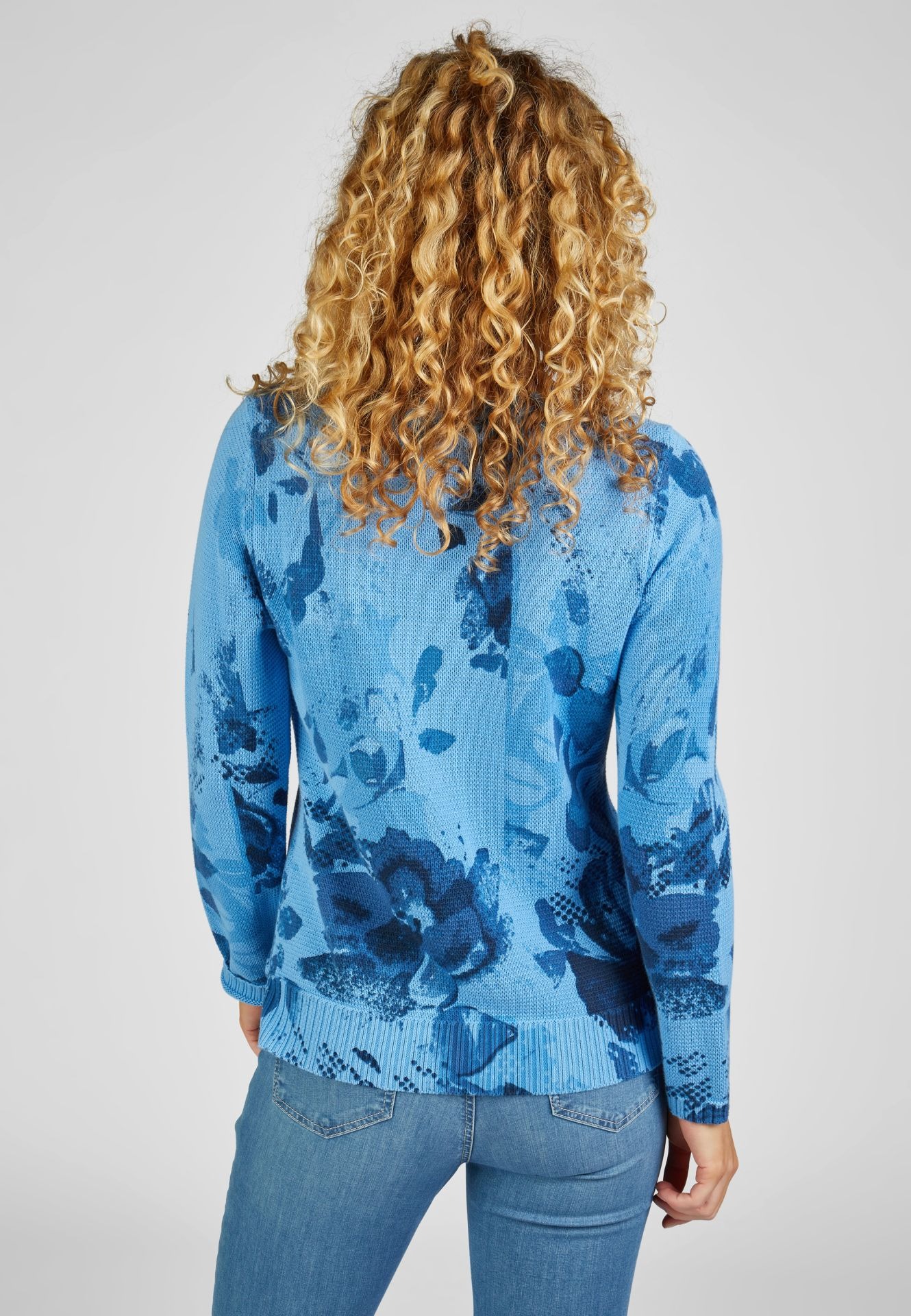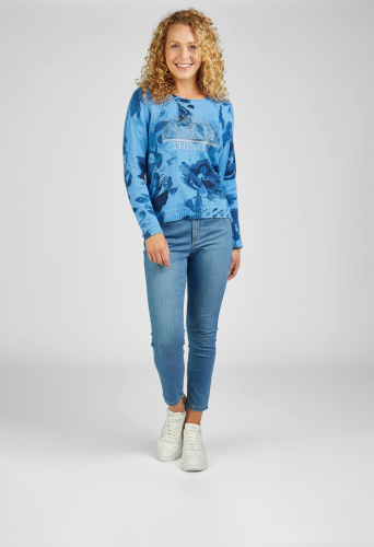 Джемпер с круглым вырезом, стильным закругленным краем и длинными рукавами — незаменимая вещь для каждой следящей за модой женщины! Свитер украшен потрясающим цветочным принтом, привлекающим внимание. В качестве особого акцента искусно вставлены блестящие камни, которые придадут вашему образу гламурный вид. Длина спинки от плеча для 44 размера: 62 см.