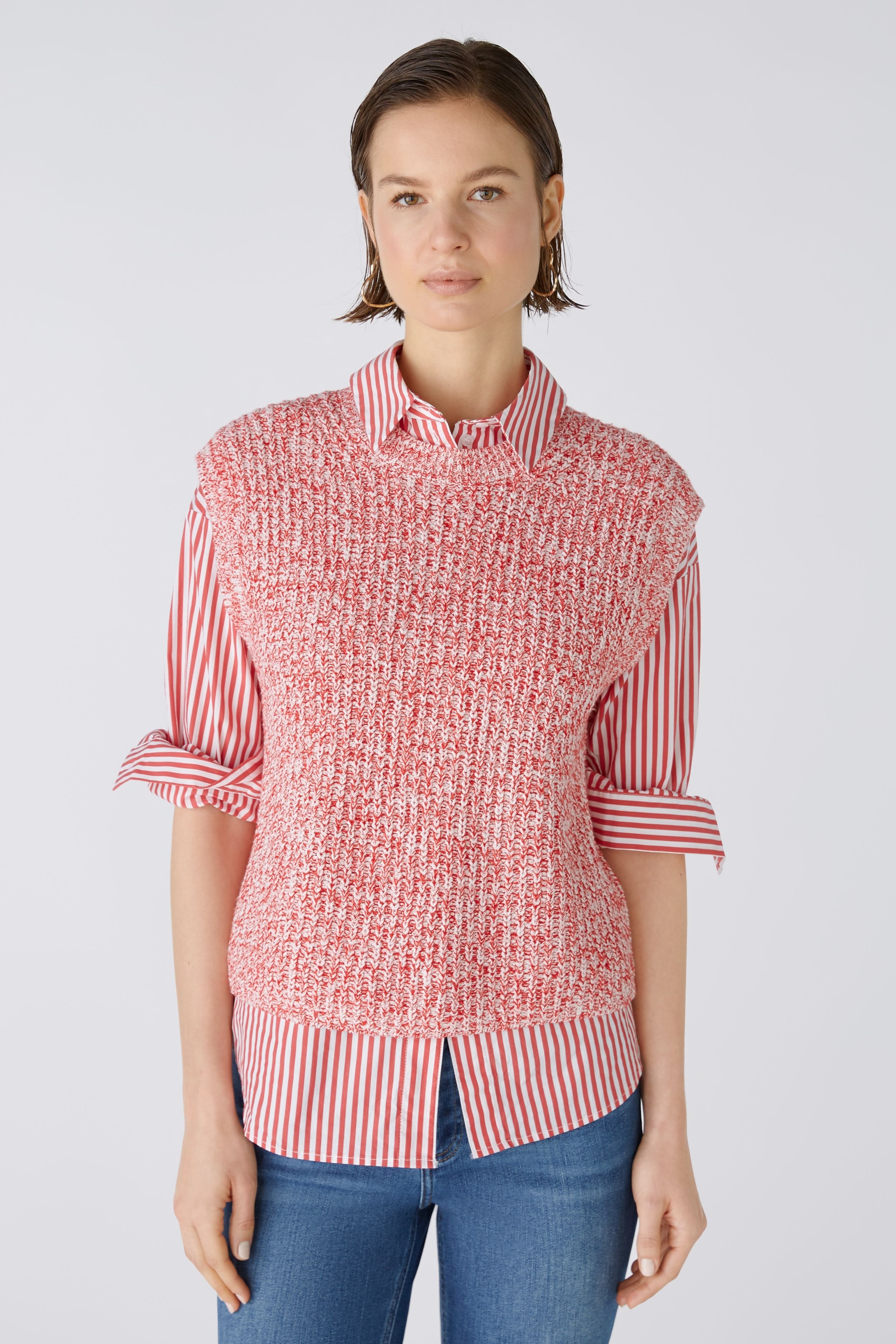 Мягкая резинка из смесового хлопка, связанная спицами из смеси пряжи Oui Iconic. Прямой крой, немного укороченный. Круглый вырез горловины с ребристой отделкой. Прямой низ, без манжет, идеально подходит для многослойной одежды. Oui Iconic смесь пряжи: разные виды пряжи, каждая разного цвета и качества, объединены по дизайну для каждого цветового варианта, в результате чего получается мягкая смесь хлопка с большой глубиной и особым эффектом. Длина для размера 42: 52 см.