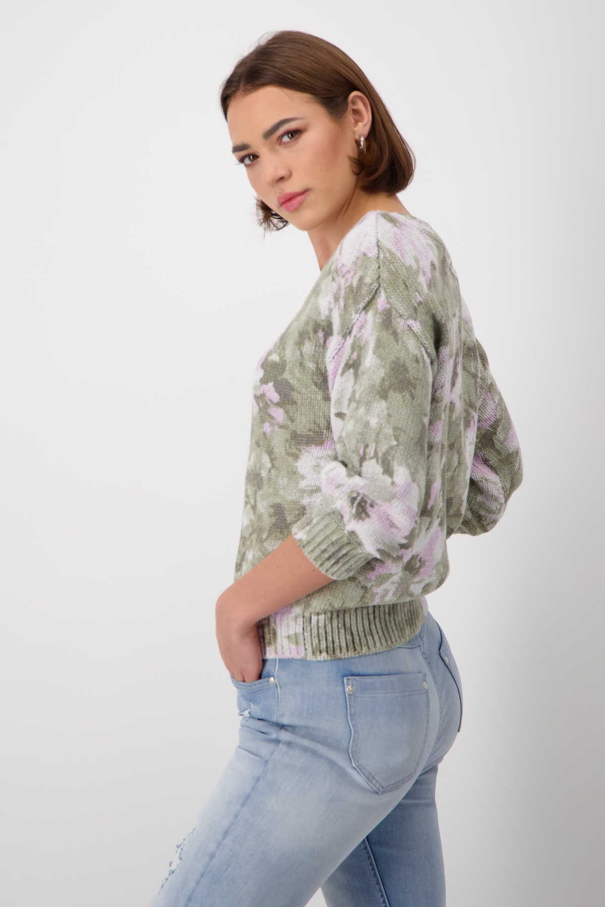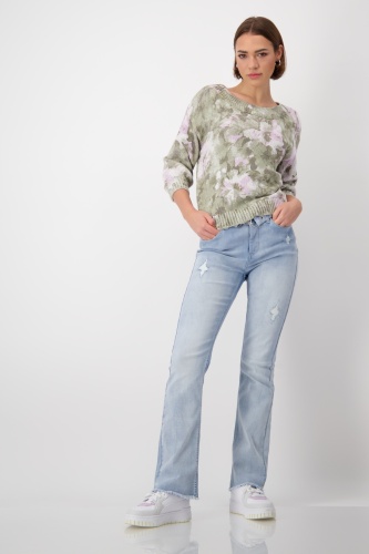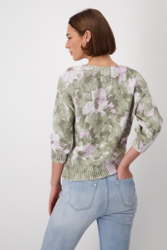 Свитер из 100% хлопка отличается красивым цветочным узором и ребристым вырезом-лодочкой. Регулярная посадка. Перерез на 3/4 руки. Ребристые манжеты и подол. Длина 44 размера 54 см.