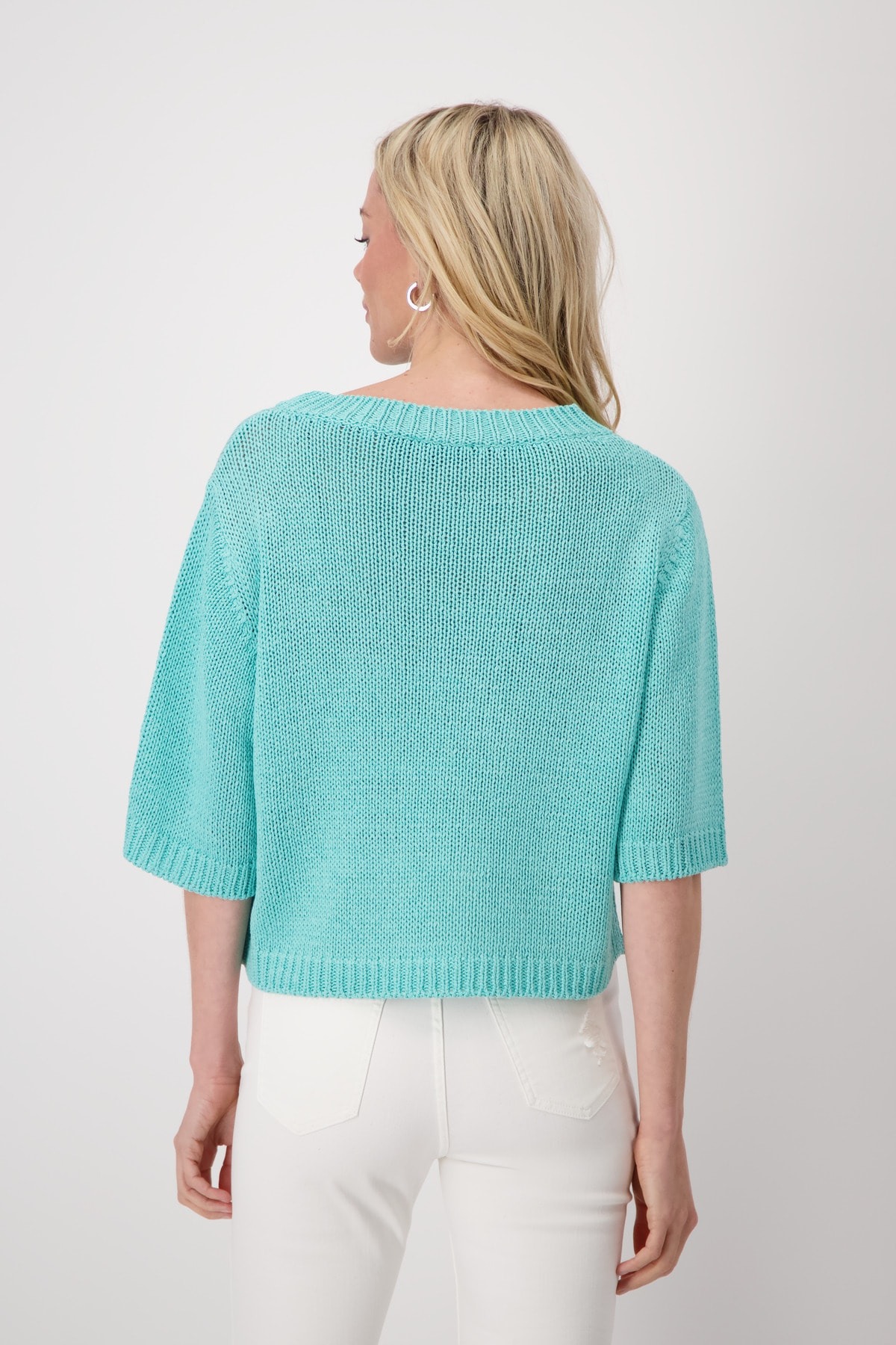 Свитер из 100% полиакрила удобен в ношении. Стиль ленточной пряжи придает образу особую нотку. Регулярная посадка. Ребристый круглый вырез. 3/4 рука. Ребристые манжеты и подол. Длина 44 размера 52 см.