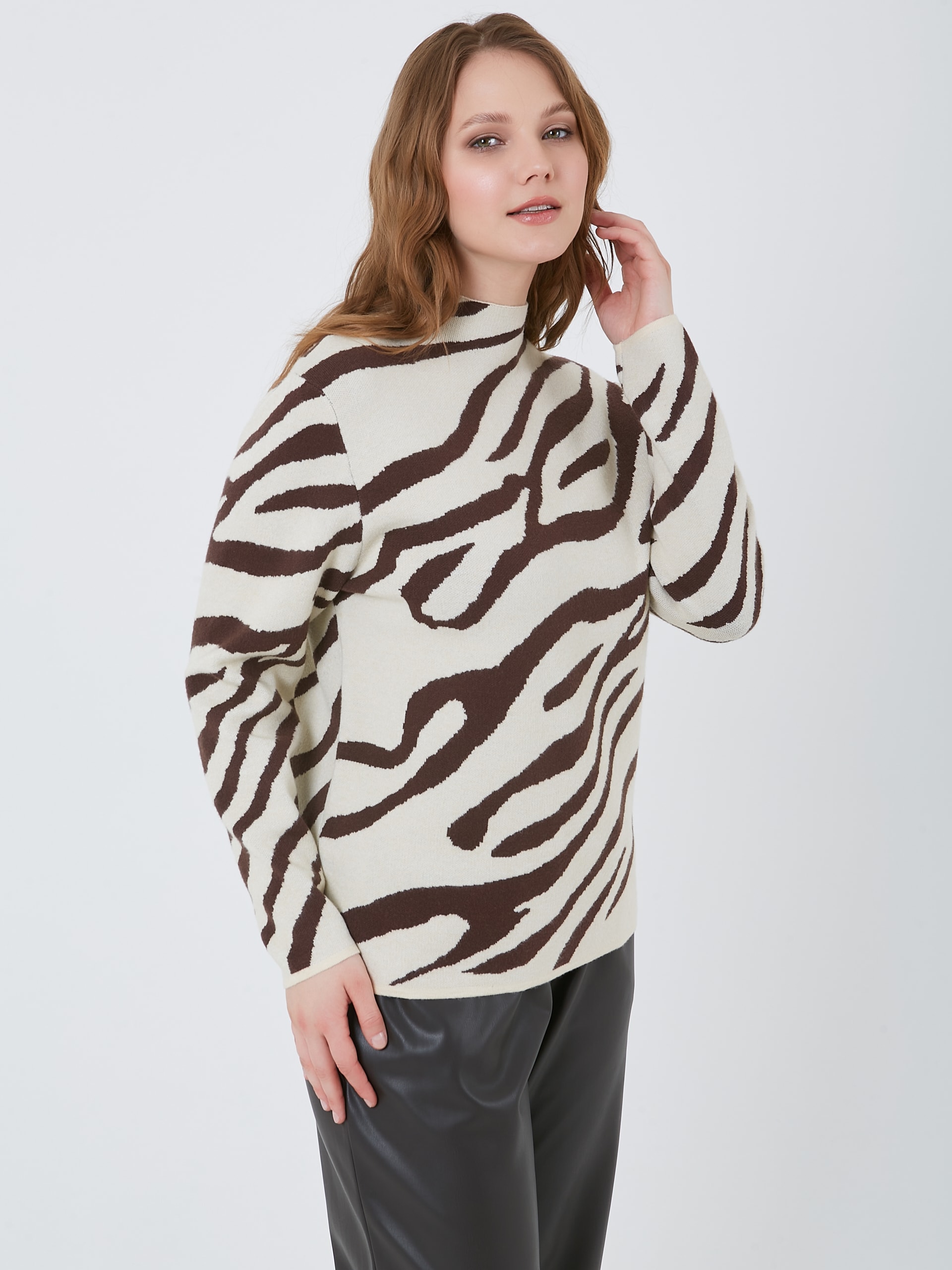 Уютный мягкий трикотажный джемпер с коричневым диагональным зебровым принтом. Осень-Зима'25/26. Капсула "Хозяйка медной горы"