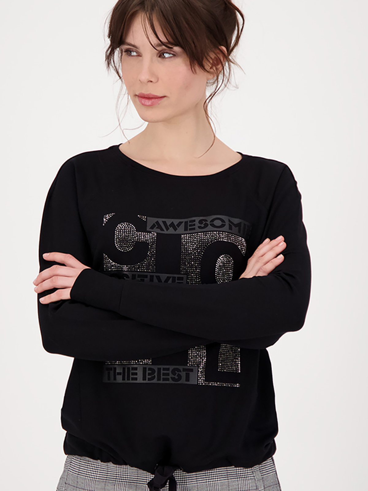 Однотонный пуловер прямого кроя с принтом на груди. Длинные рукава реглан, овальный вырез горловины. Пуловер может выступать как самостоятельный верх или надеваться под жакет или кардиган.