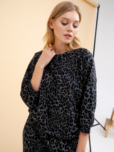 Джемпер с анималистичным узором по всей поверхности изделия. Свободный крой, круглый вырез горловины. Длинные втачные рукава с трикотажными манжетами. Эластичная лента по низу изделия.