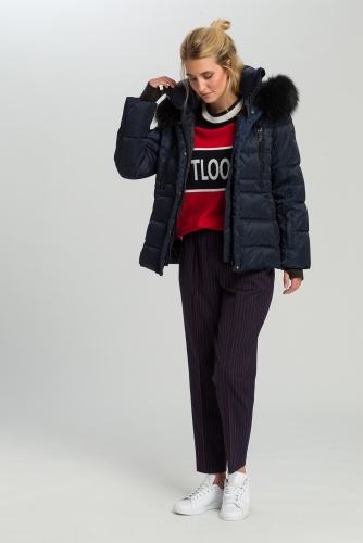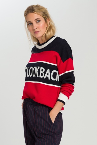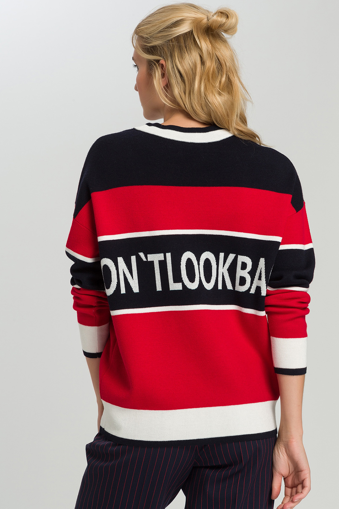 Яркий джемпер с принтом для трендового образа! Круглый вырез горловины, втачной рукав полной длины со спущенной линией плеча.