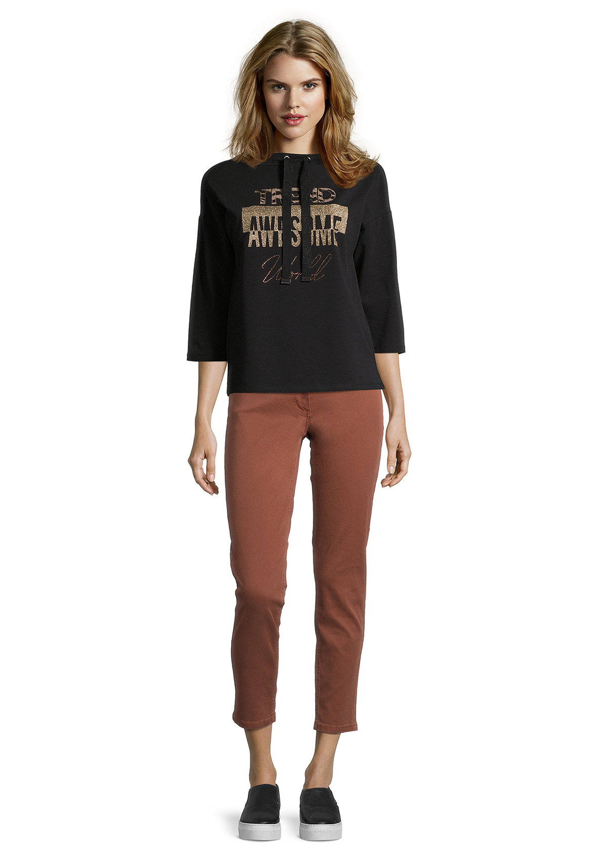 Джемпер прямого покроя. Рукава 3/4 со спущенным плечом, воротник с завязками. Перед изделия декорирован металлизированным принтом. Контрастная вставка с анималистическим принтом на спинке. Приятный эластичный материал из смеси хлопка и модала.