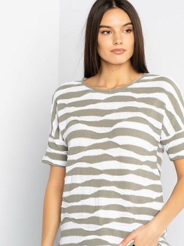 Джемпер с коротким рукавом. Состав ткани из хлопка из синтетических материалов обеспечивает отличную посадку и легкость в уходе. В дизайне интересно обыгран тренд на полоску: создается оптическая иллюзия волн. Нейтральные цвета джемпера делают его универсальным элементом любого гардероба.