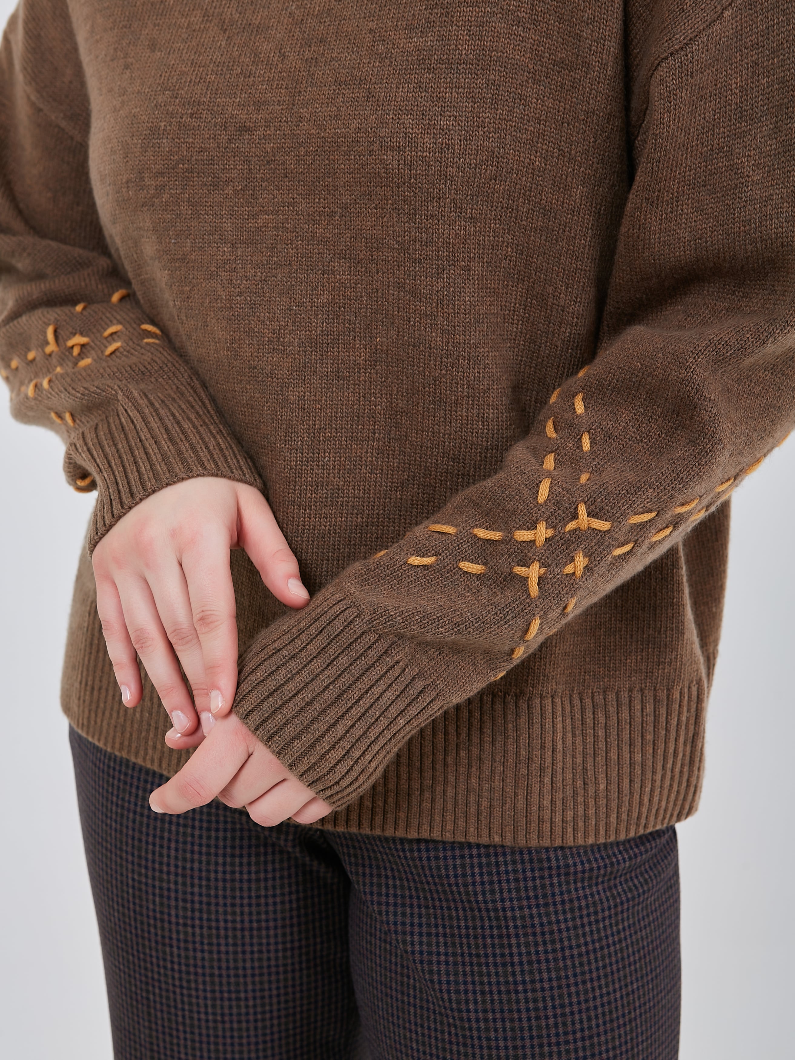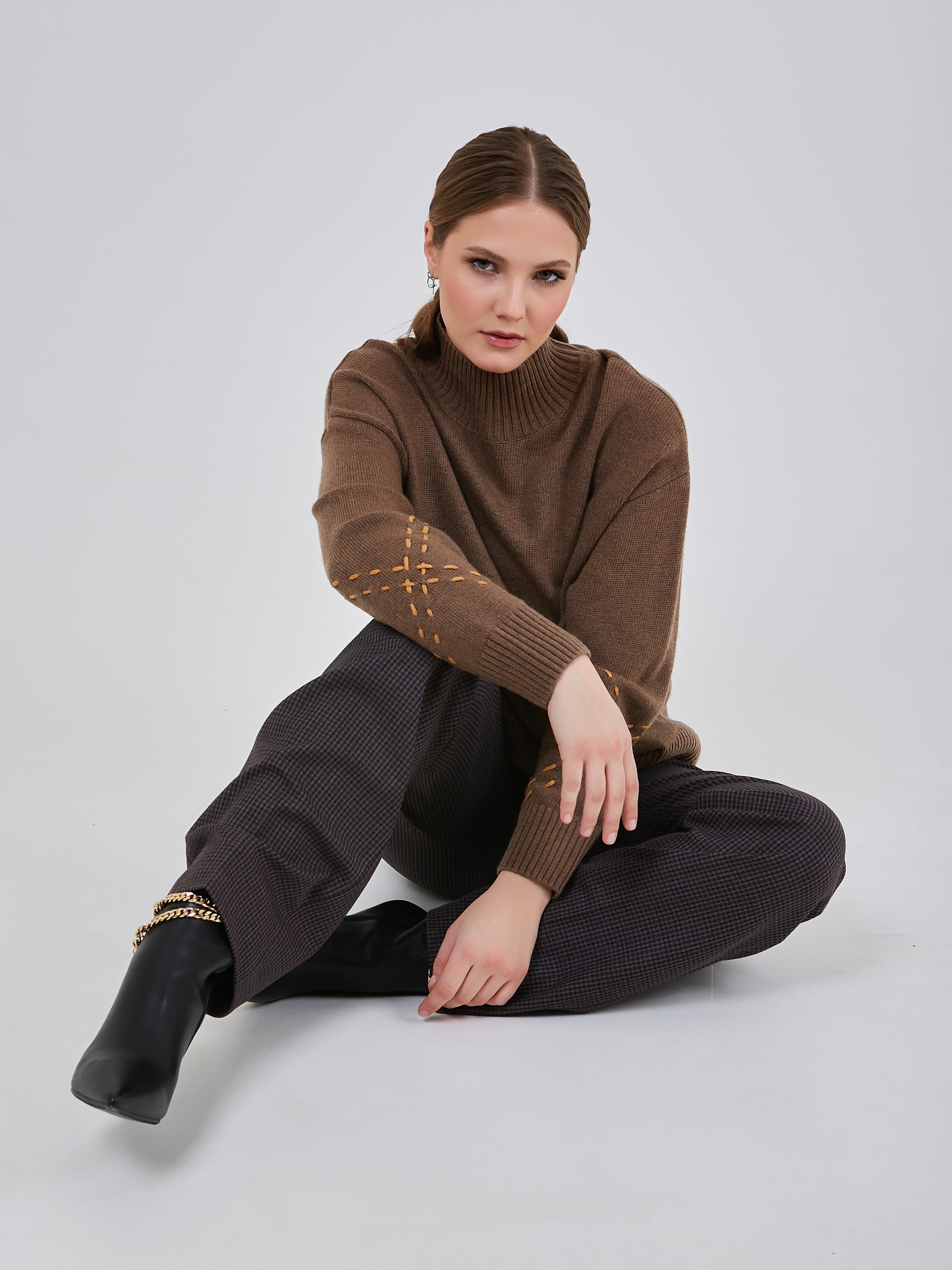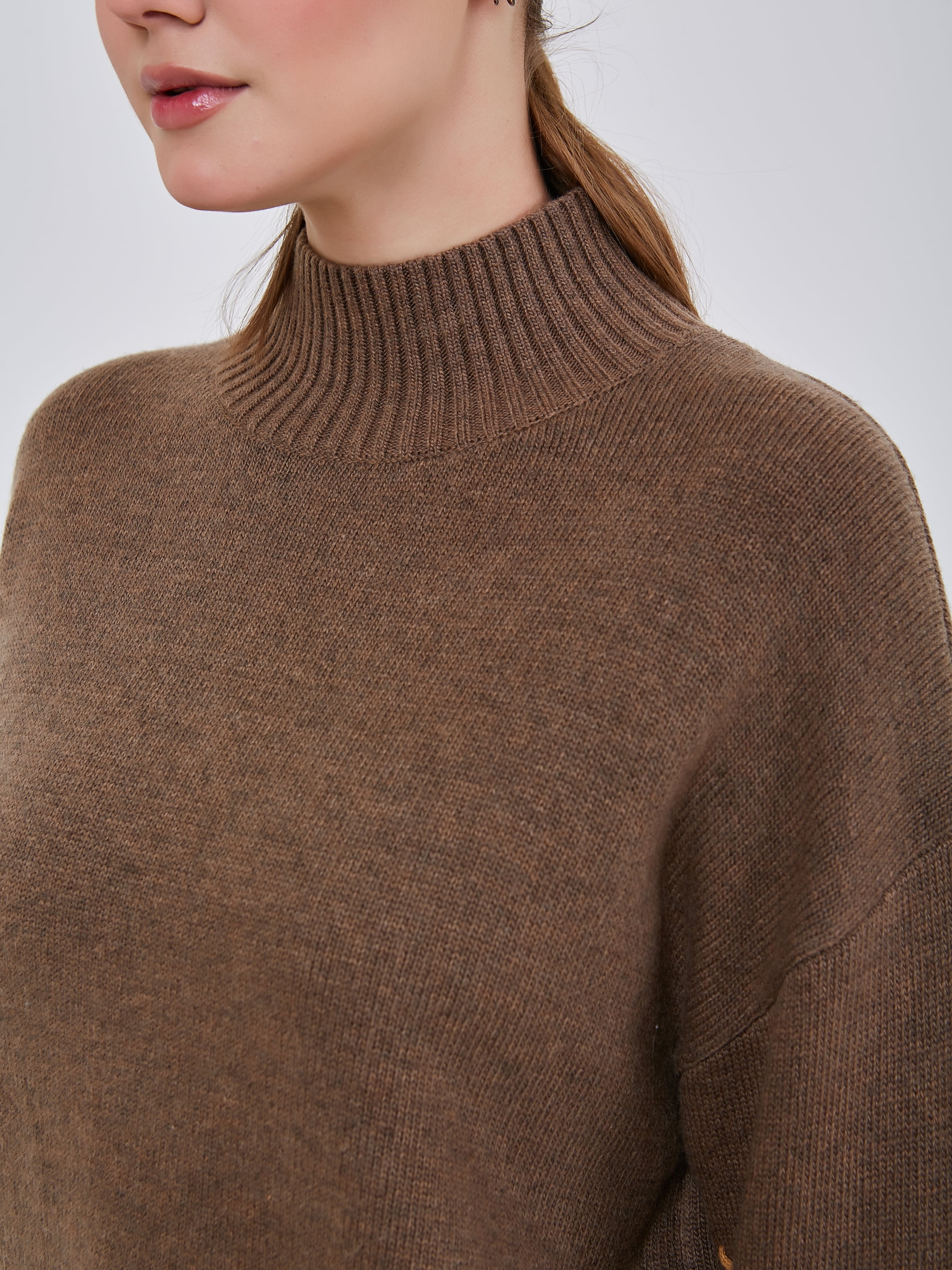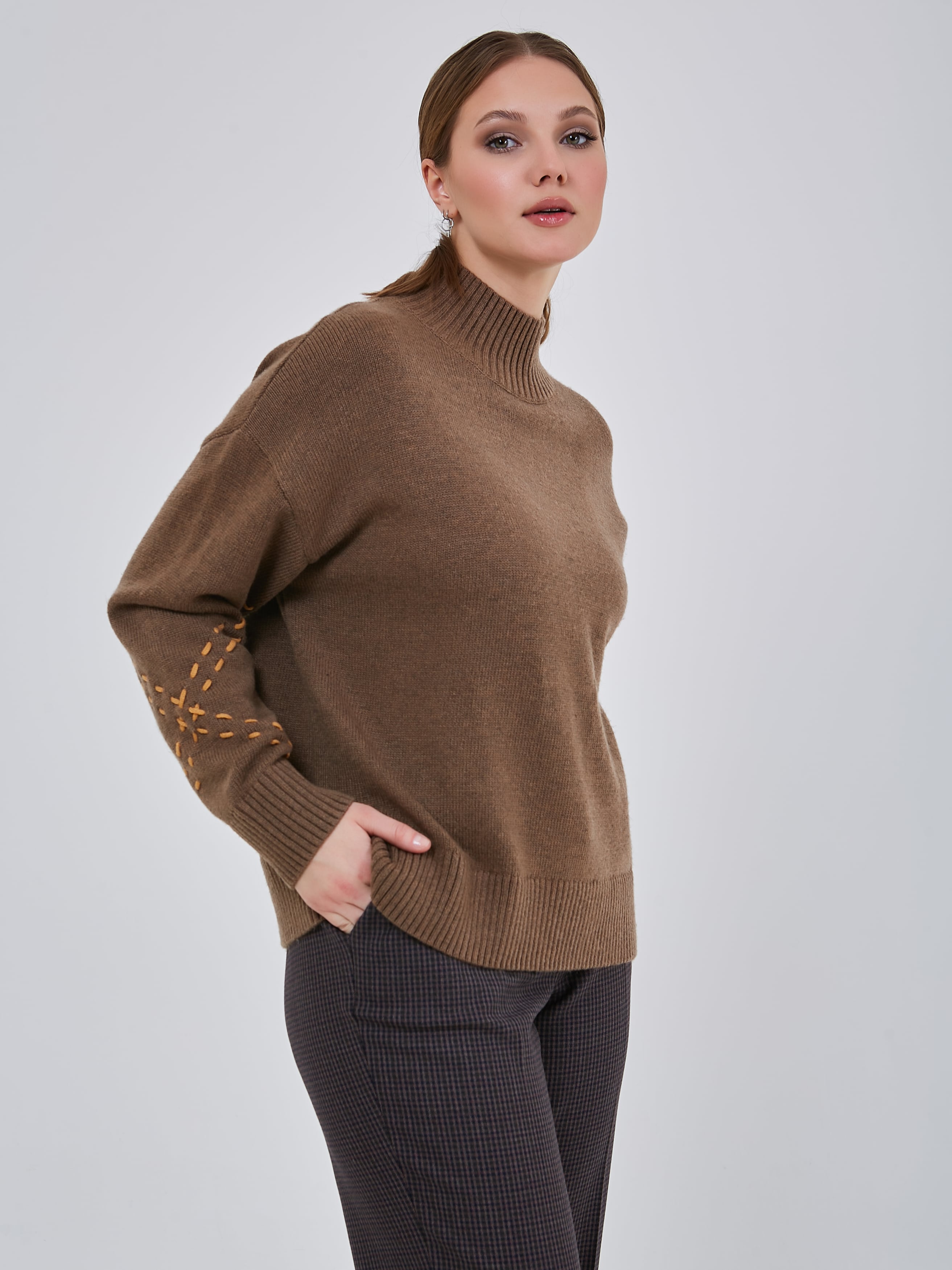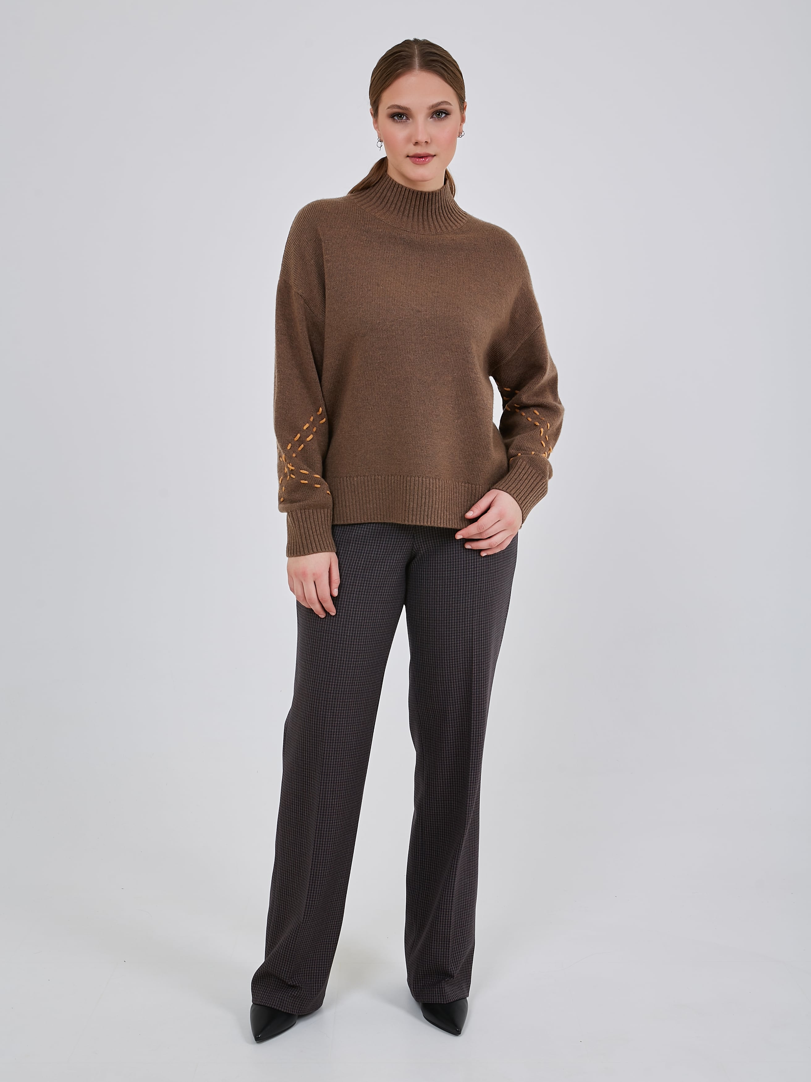 Джемпер шоколадного оттенка со спущенной линией плеча, с широкими эластичными манжетами, воротником и резинкой по низу изделия. Рукава украшены контрастными нитями в виде ручного шва. Осень-Зима'25/26. Капсула "Хозяйка медной горы"