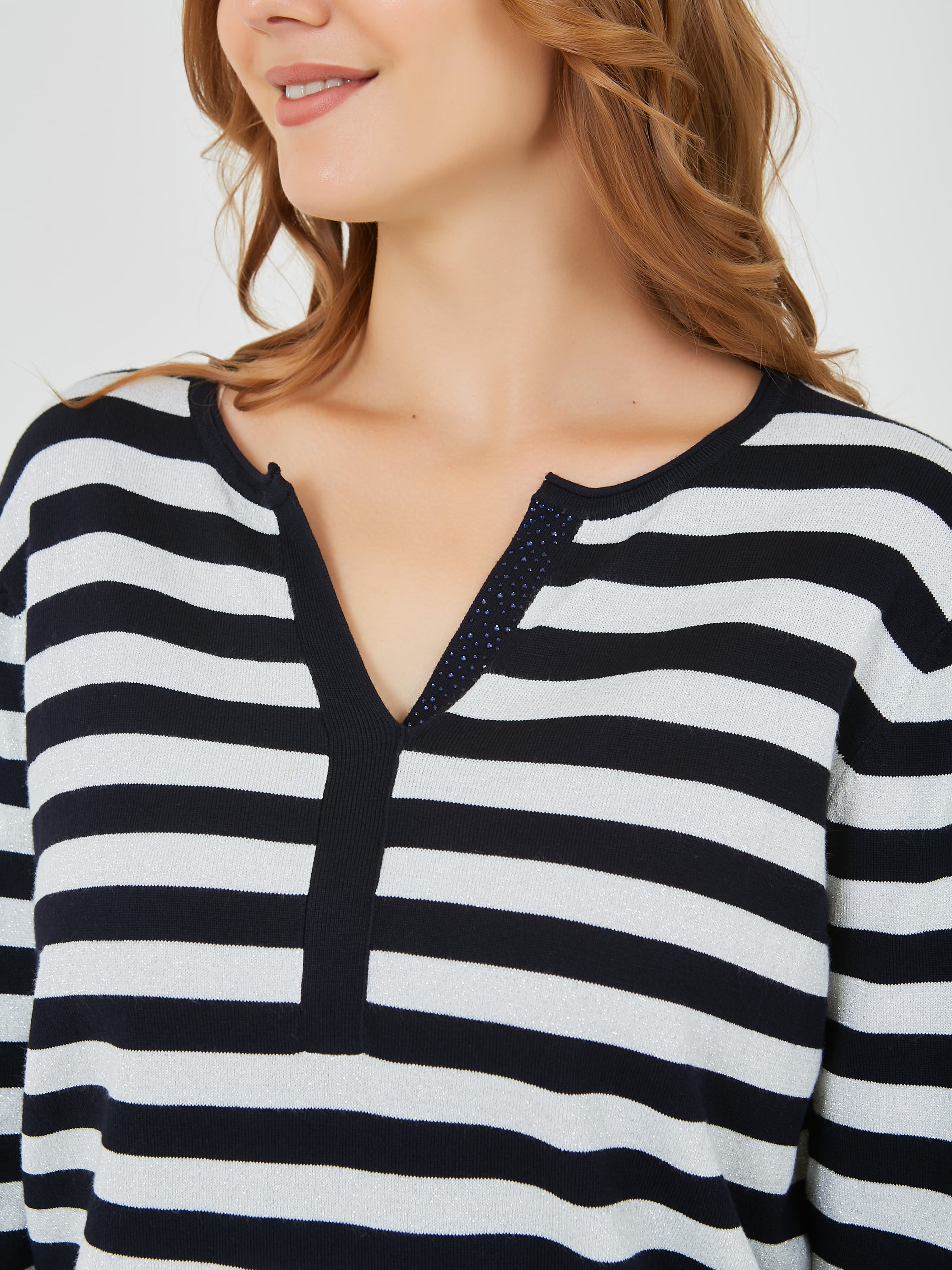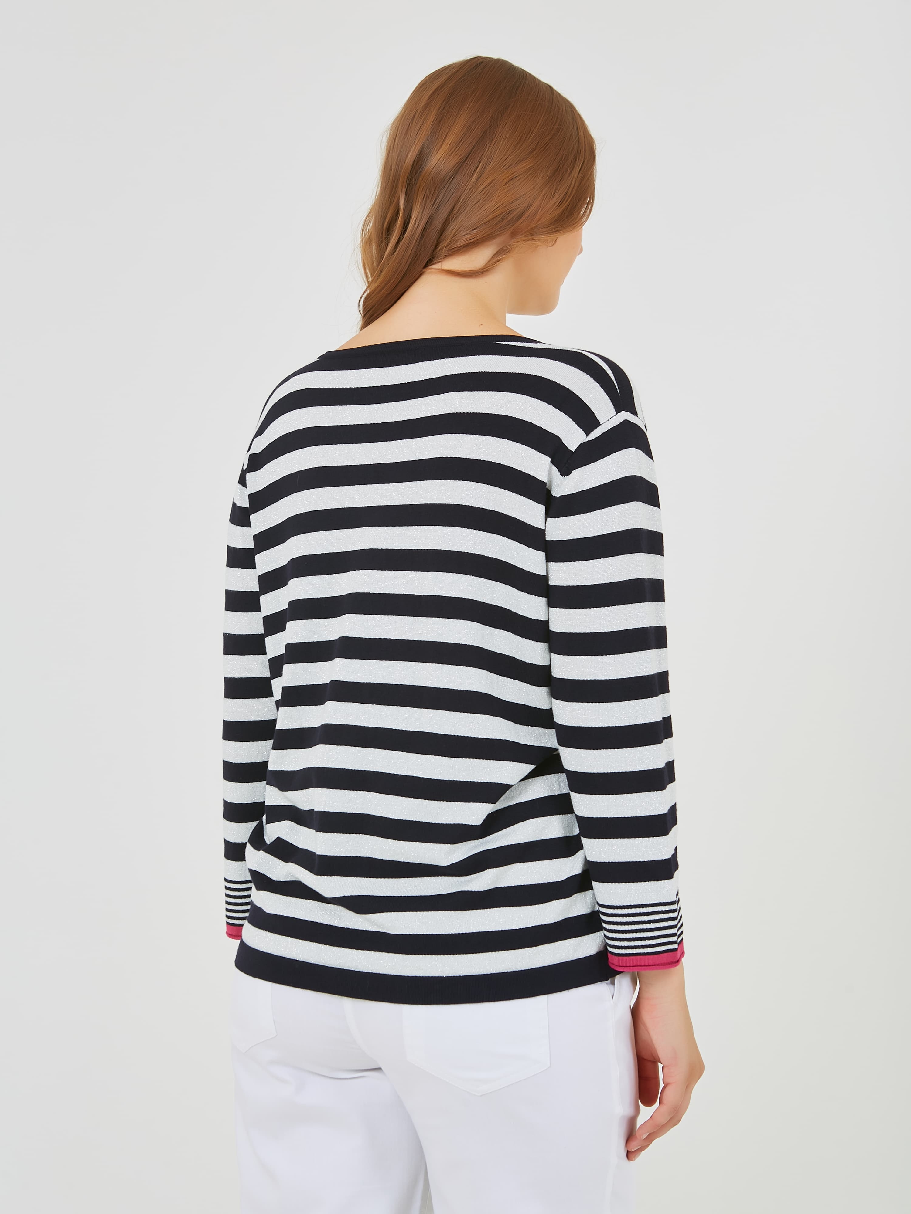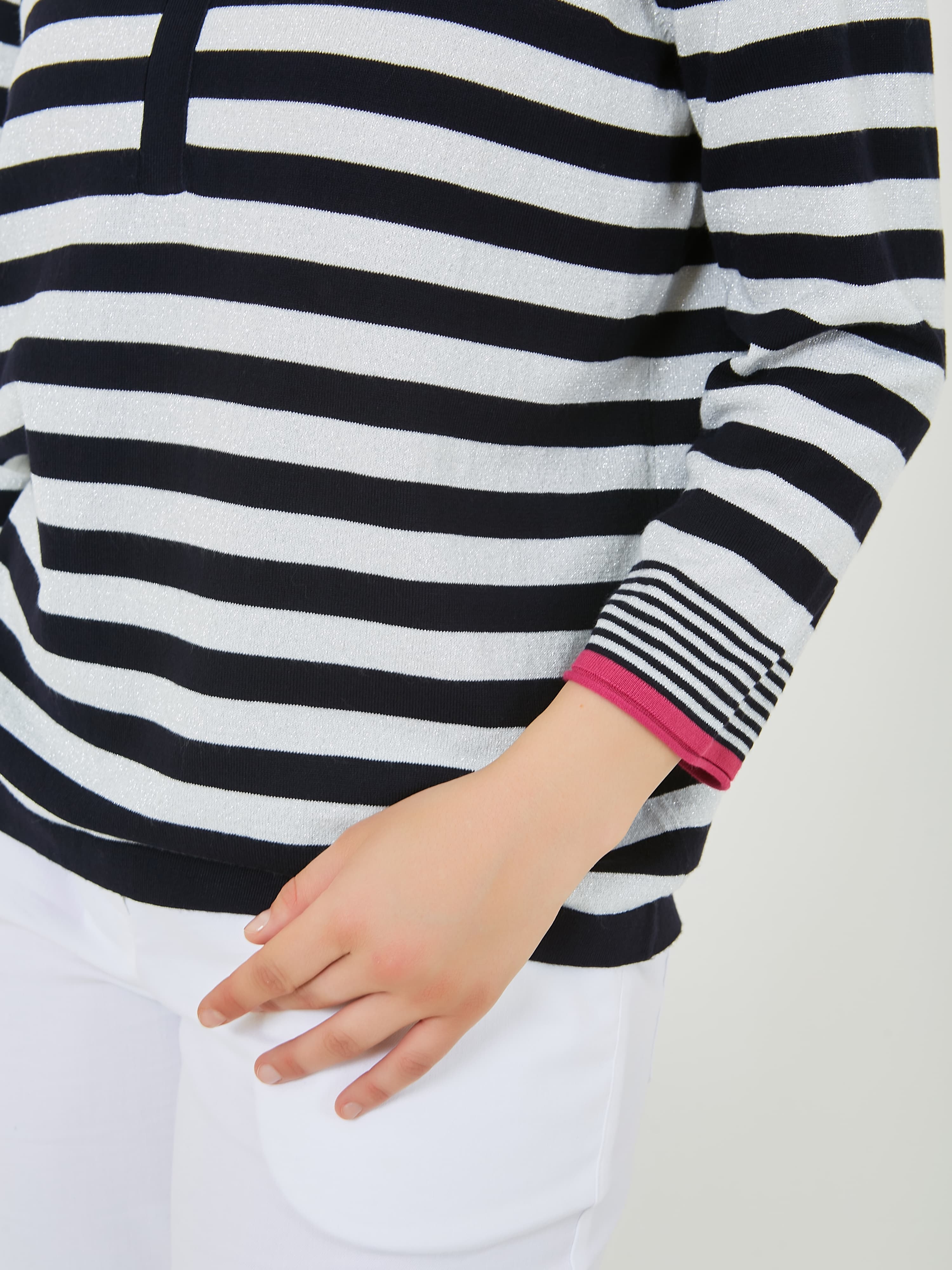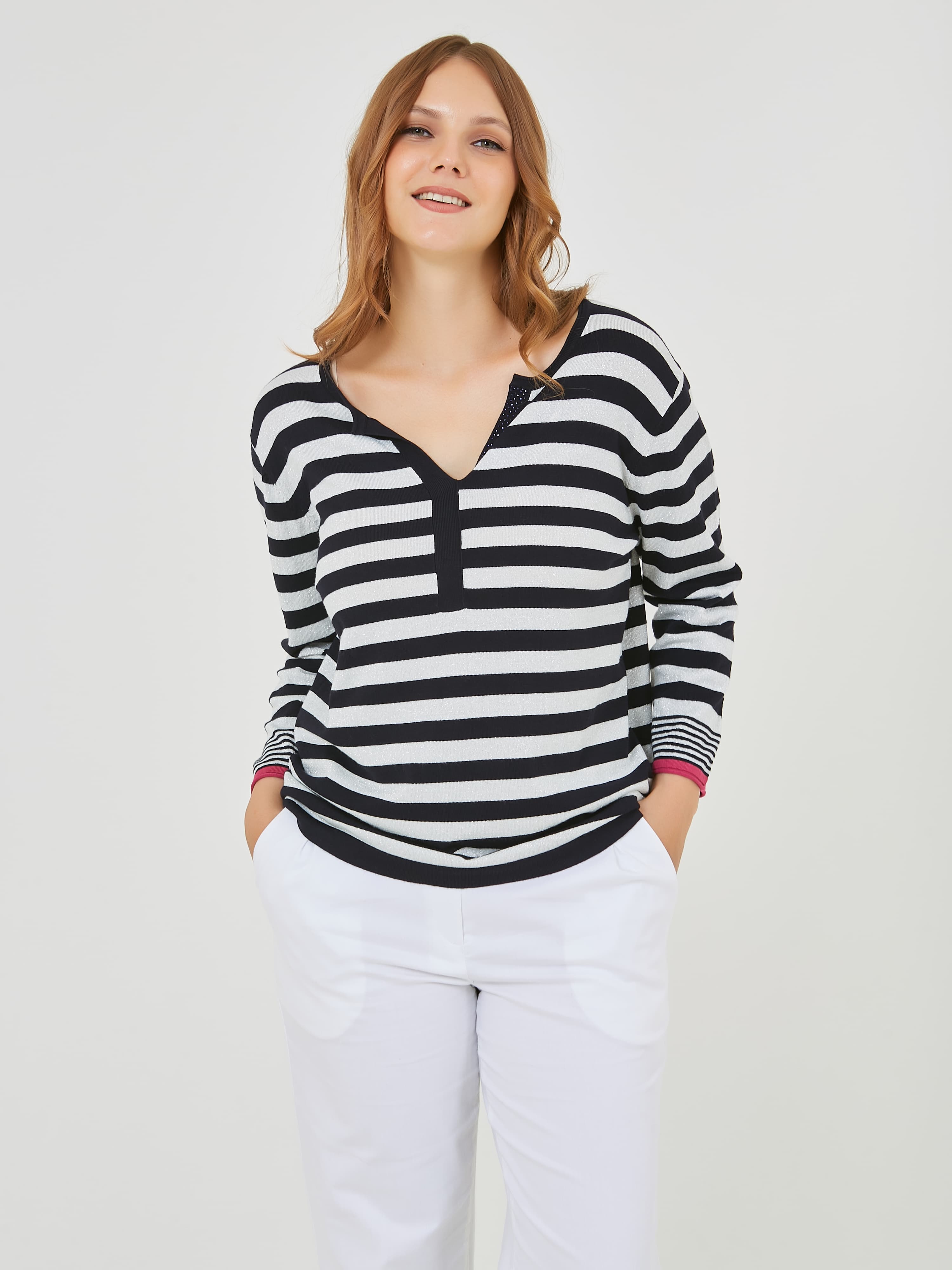 Джемпер в полоску с ярким кантом по рукаву. Весна-Лето 2025. Капсула "Самарканд". Параметры модели: 95-64-101, рост 175, размер 44-46