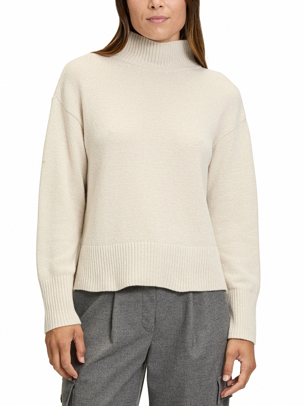 Классический свитер молочного цвета с высоким горлом и выточками по бокам. Подойдет как к классическому так и к свободному стилю
