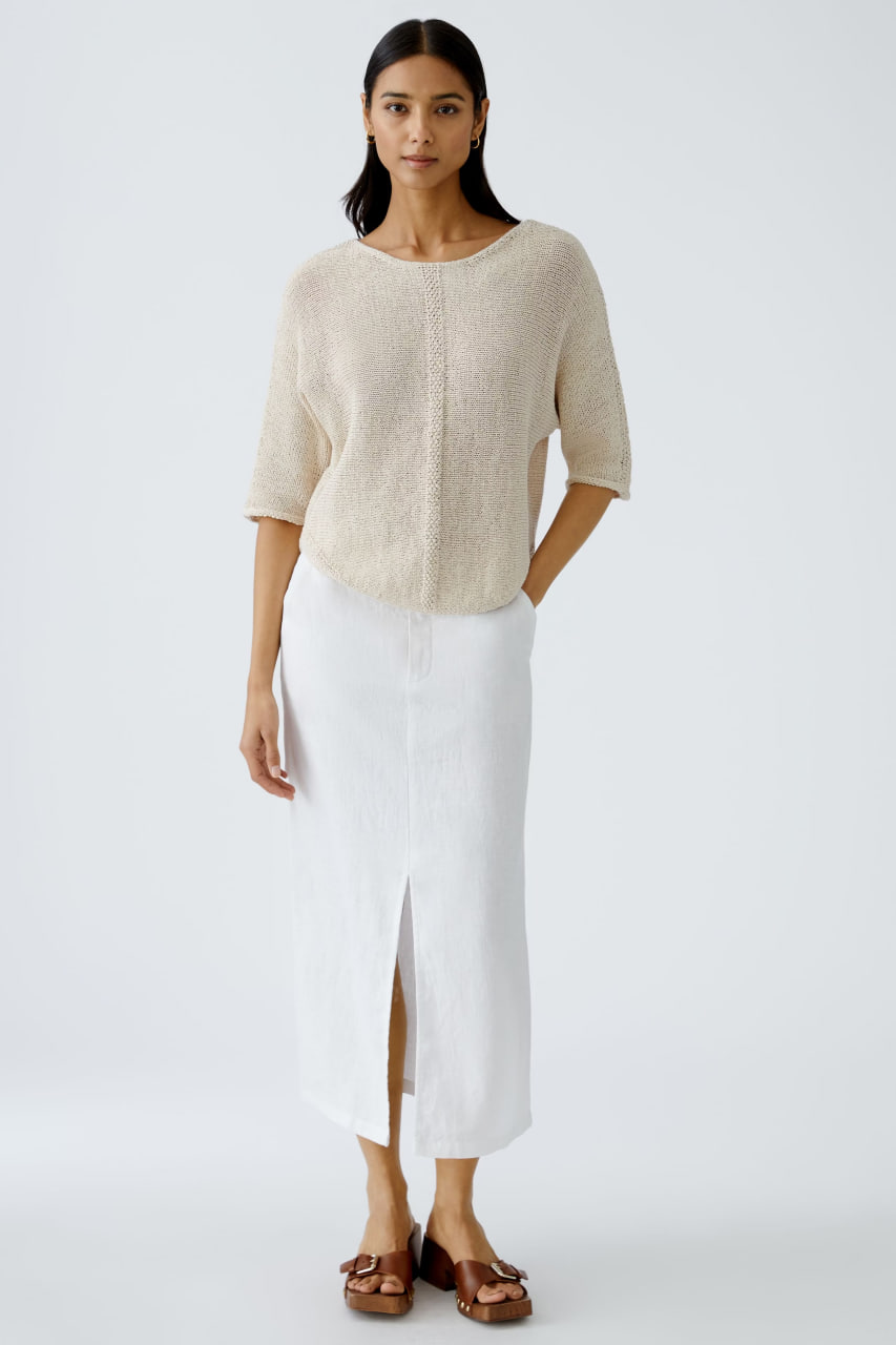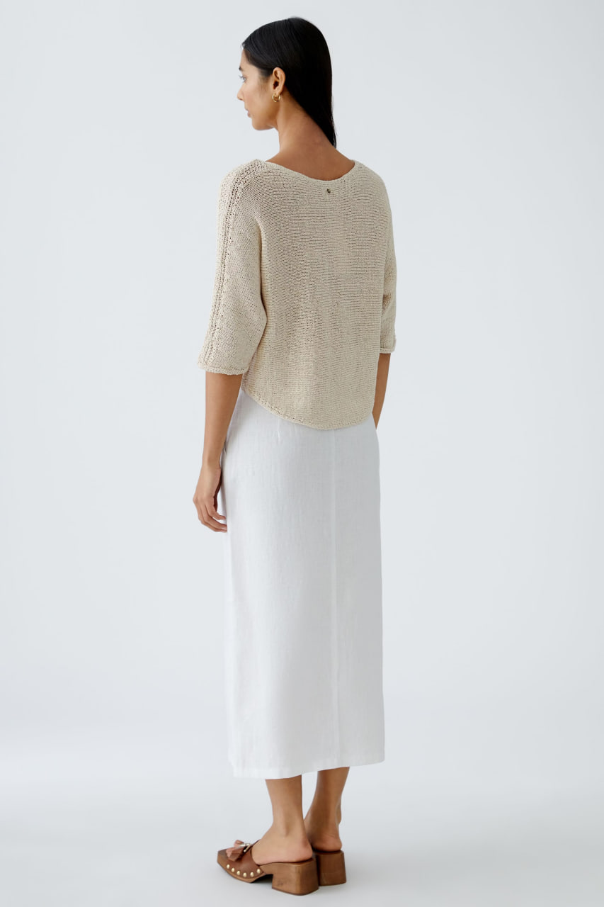 Джемпер выполнен в светлом бежевом оттенке, который придает изделию мягкость и естественность. Модель имеет свободный, немного укороченный крой с рукавами длиной до локтя. Ткань связана крупной вязкой с текстурным узором по центру переда, добавляющим интересную деталь. Джемпер отличается округлым вырезом горловины и аккуратной отделкой краев, что делает его универсальным и стильным элементом гардероба.