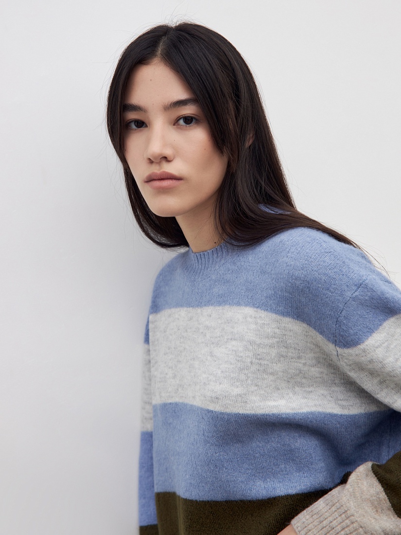 Уютный базовый свитер в полоску, круглый вырез горловины, рукав полной длины. Благодаря смесовомой композиции пряжи и содержанию овечьей шерсти свитер имеет мягкую дышащую поверхность, которая приятна при соприкосновении с кожей.