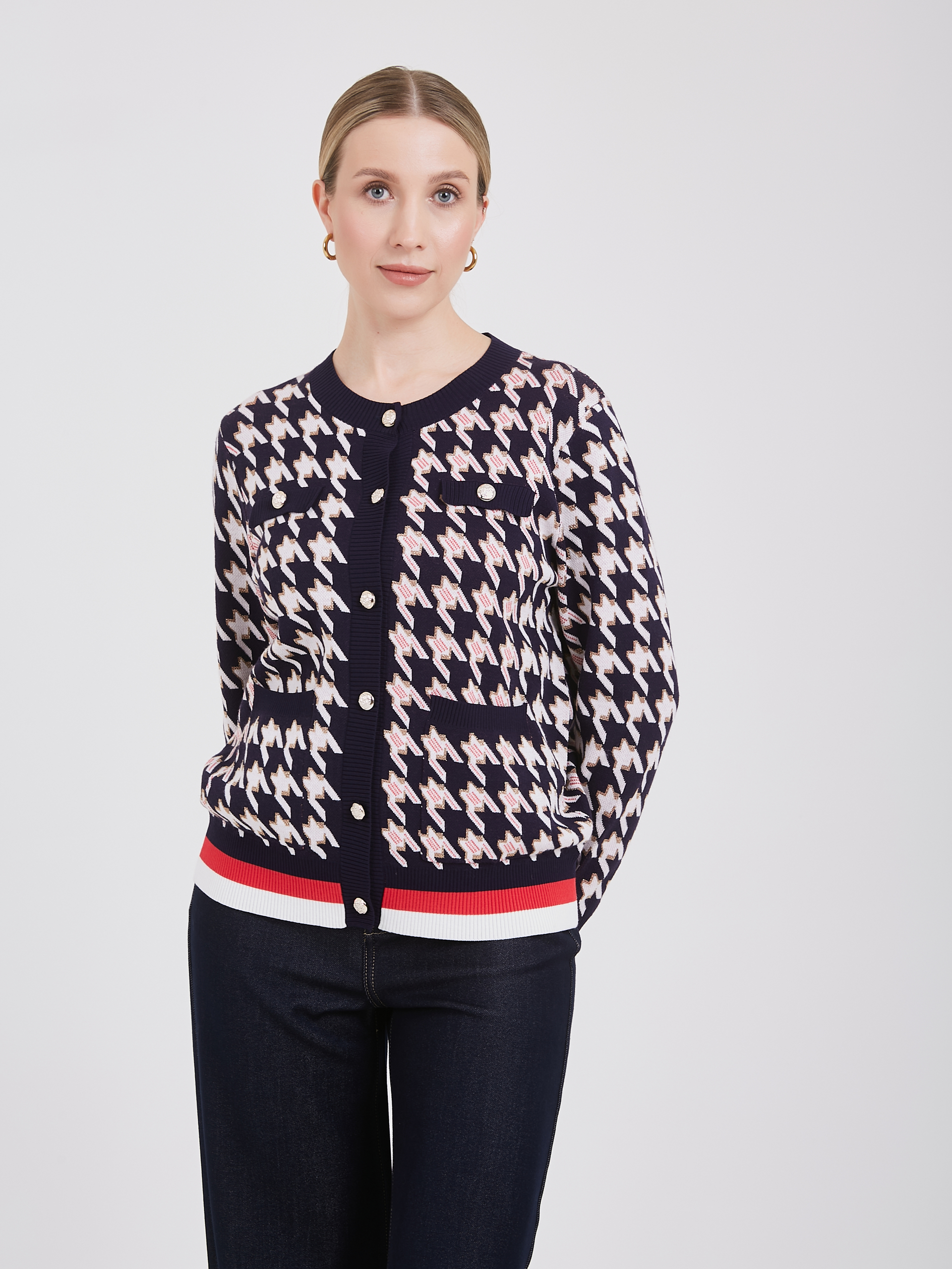 Темно-синий кардиган с узором "гусиная лапка" белого и розового цветов сочетает в себе классический стиль и современный дизайн. Застежка на несколько светлых пуговиц добавляет элегантности, а нижняя часть кардигана с белой и красной полоской создает яркий акцент. Такой кардиган станет универсальным выбором для создания любых образов. Осень-Зима'25/26. Капсула "Алые Паруса"