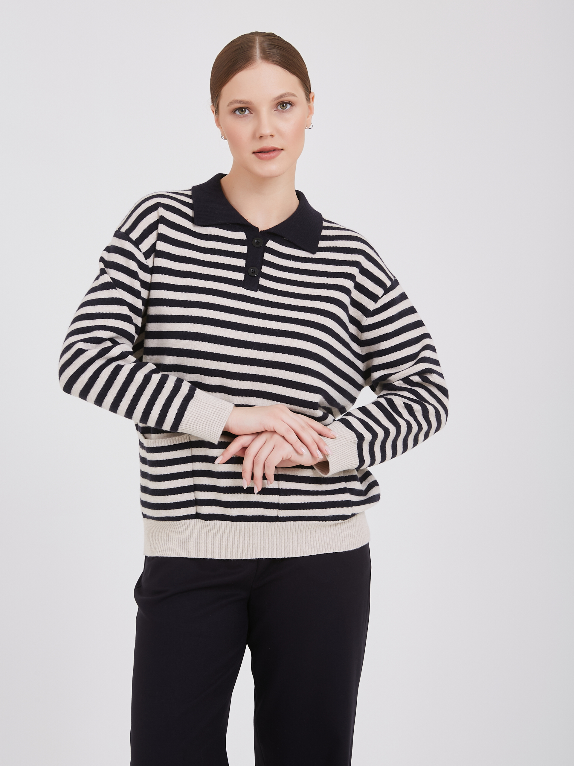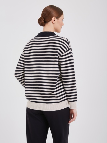 Полосатый свитер классического стиля. Темно-синие и белые горизонтальные полосы задают ритм, создавая динамичный образ. Воротник-поло и два передних кармана добавляют нотку спортивного шика. Бежевые манжеты и нижний край завершают композицию, привнося тепло и уют. Материал высокого качества обеспечивает комфорт. Осень-Зима'25/26. Капсула "Алые Паруса"