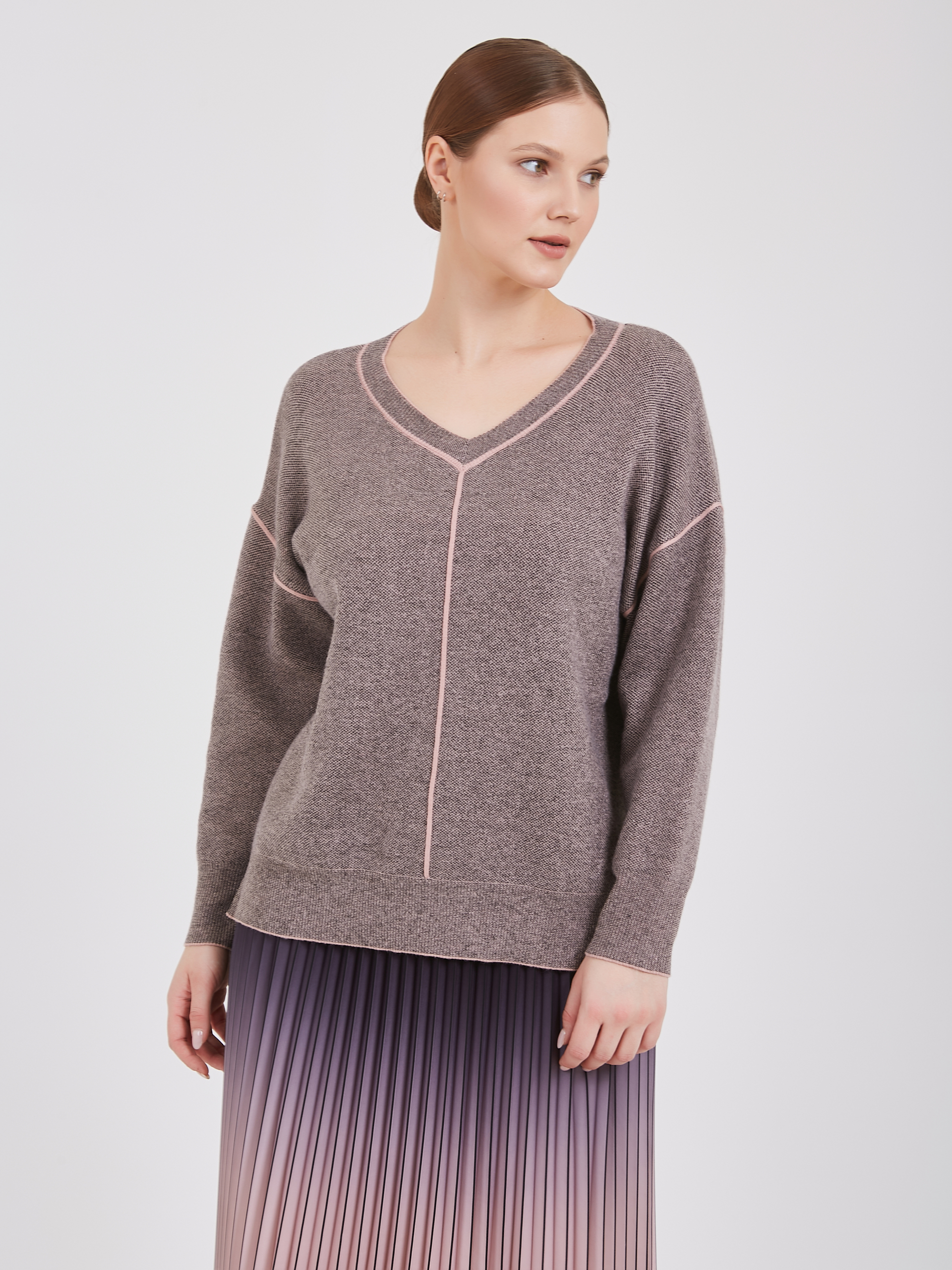 Коричневый свитер с выразительным V-образным вырезом, окантованным нежной розовой нитью. Модель отличается приятной текстурой, словно выполнена из тонкого вязания. Удлинённые рукава добавляют комфорта и завершают образ.Осень-Зима'25/26. Капсула "Лиловый шар"