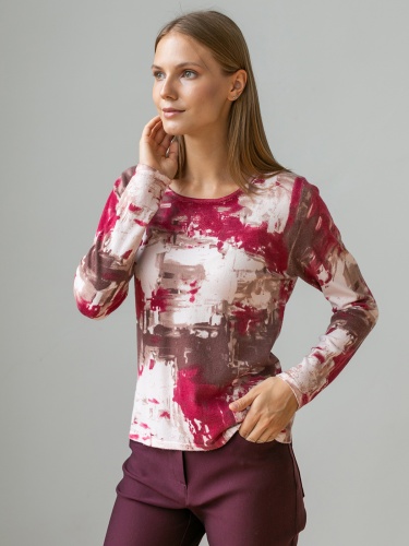 Джемпер с ярким абстрактным принтом выполнен в трех оттенках: бордовом, синем и коричневом. Широкий овальный вырез горловины подчеркивает изящество линии шеи. Полуприлегающий силуэт подчеркивает женственность форм. Джемпер сочетаетается с юбкой и брюками и расставляет яркие акценты в вашем аутфите.