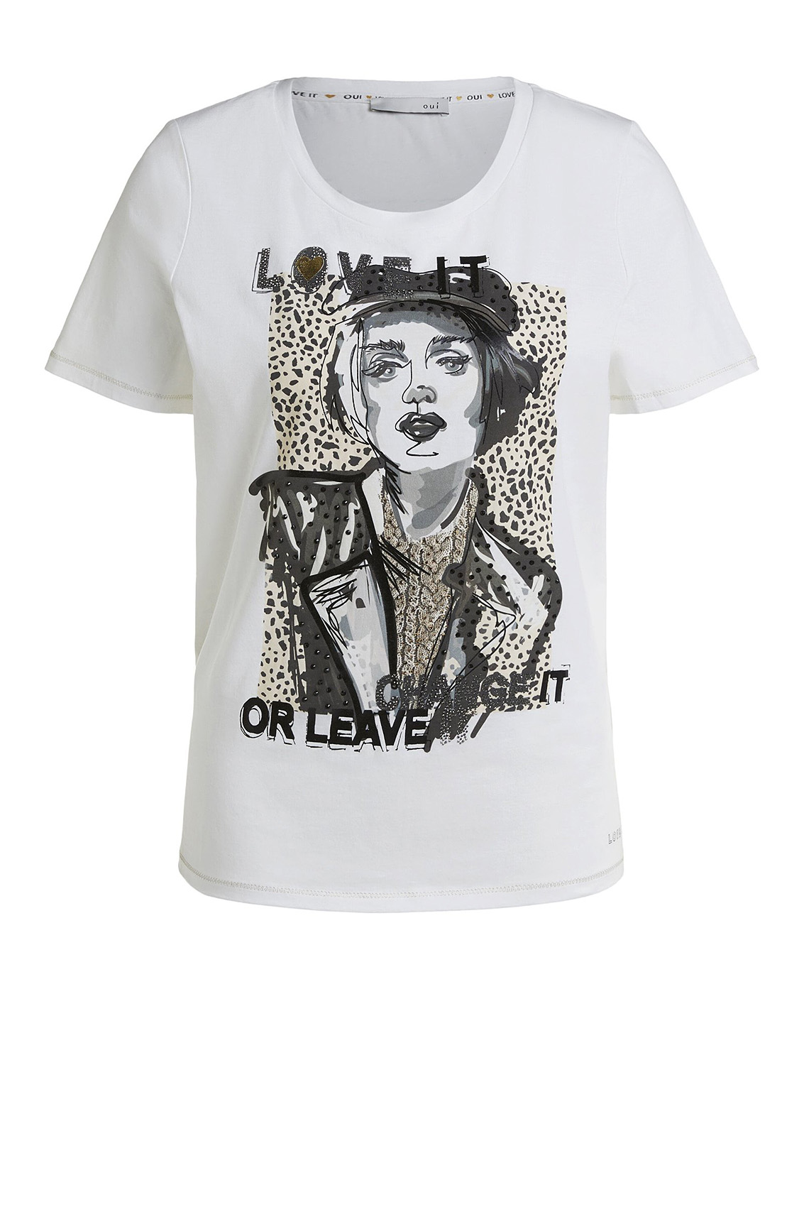 Белая футболка привлекает внимание своим смелым принтом. Прямой крой, круглый вырез горловины, короткие втачные рукава с фиксированными манжетами. Хлопковый материал приятен к телу и обеспечивает комфорт в ношении. Футболка создает демократичный образ и прекрасно сочетается как с брюками, так и с юбкой.