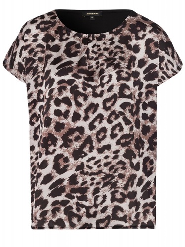 Блуза с анималистичным принтом спереди. Короткий цельнокроеный рукав, овальный вырез горловины, однотонная спинка. Блуза подходит для образов с юбкой или брюками, носится как заправленной, таки навыпуск.