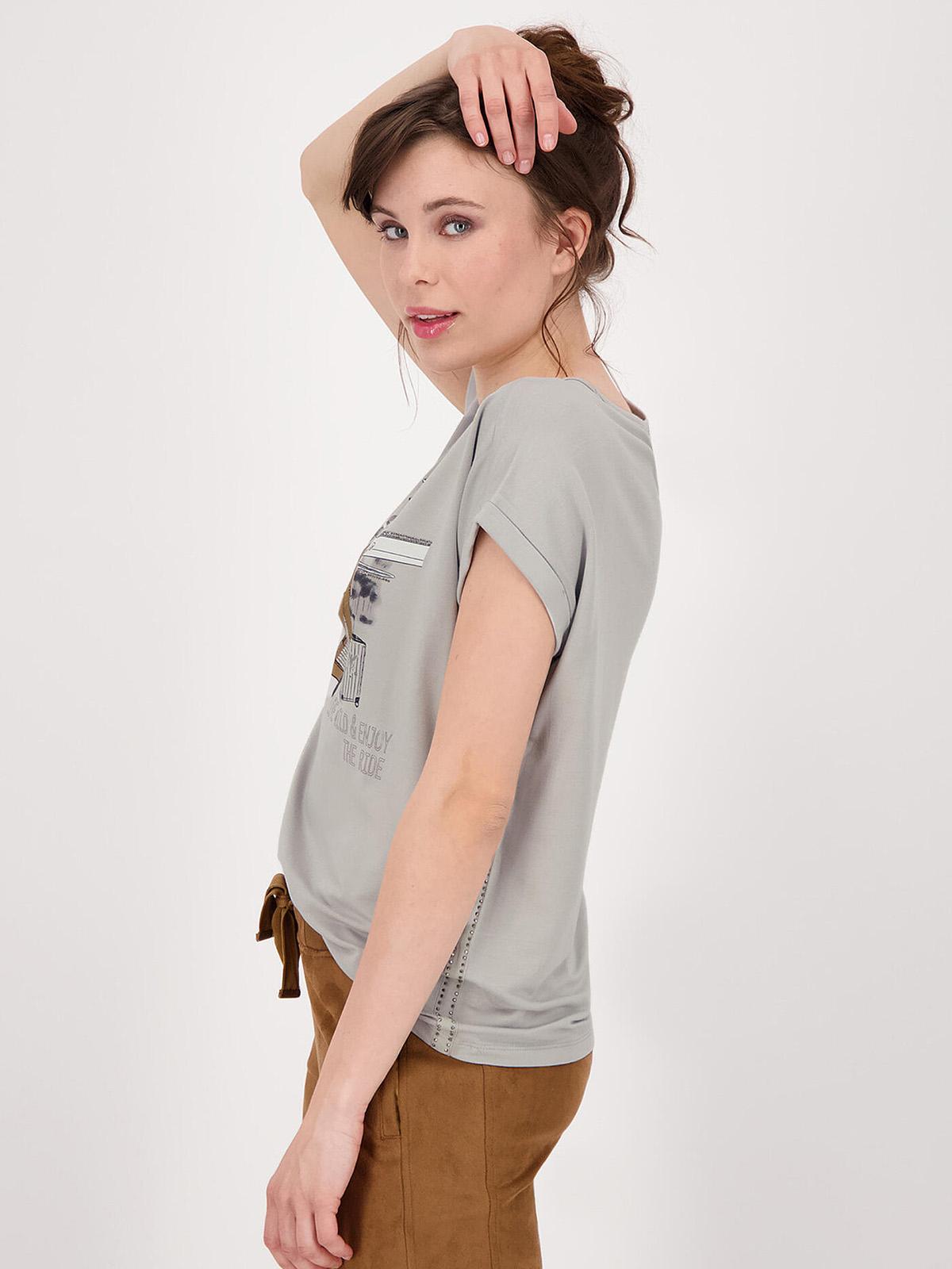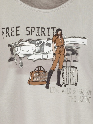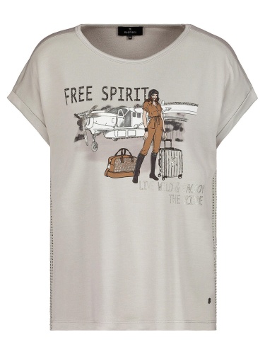 Однотонная футболка прямого кроя с оригинальным принтом на груди. Цельнокроеный короткий рукав, овальный вырез горловины. Футболка – универсальный элемент гардероба, можно носить как заправленной, так и на выпуск, сочетать с жакетом или кардиганом, а также использовать как самостоятельный верх.