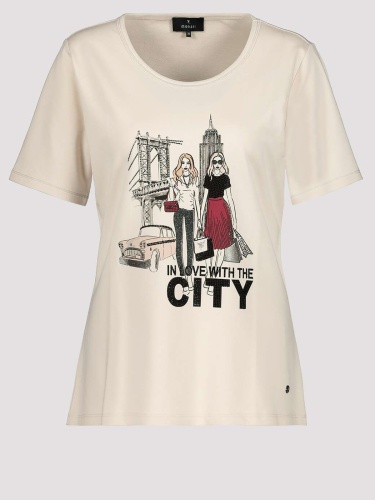 Однотонная бежевая футболка с принтом на груди. Прямой крой, широкий овальный вырез горловины, короткий втачной рукав. Футболка может выступать как самостоятельный верх или надеваться под жакет или кардиган.