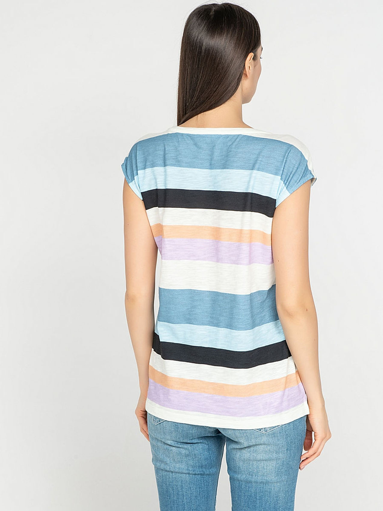 Футболка слегка приталенного силуэта. Круглый вырез, короткие цельнокроеные рукава, небольшие разрезы по бокам. Трендовая полоска. Декор: вышивка пайетками.