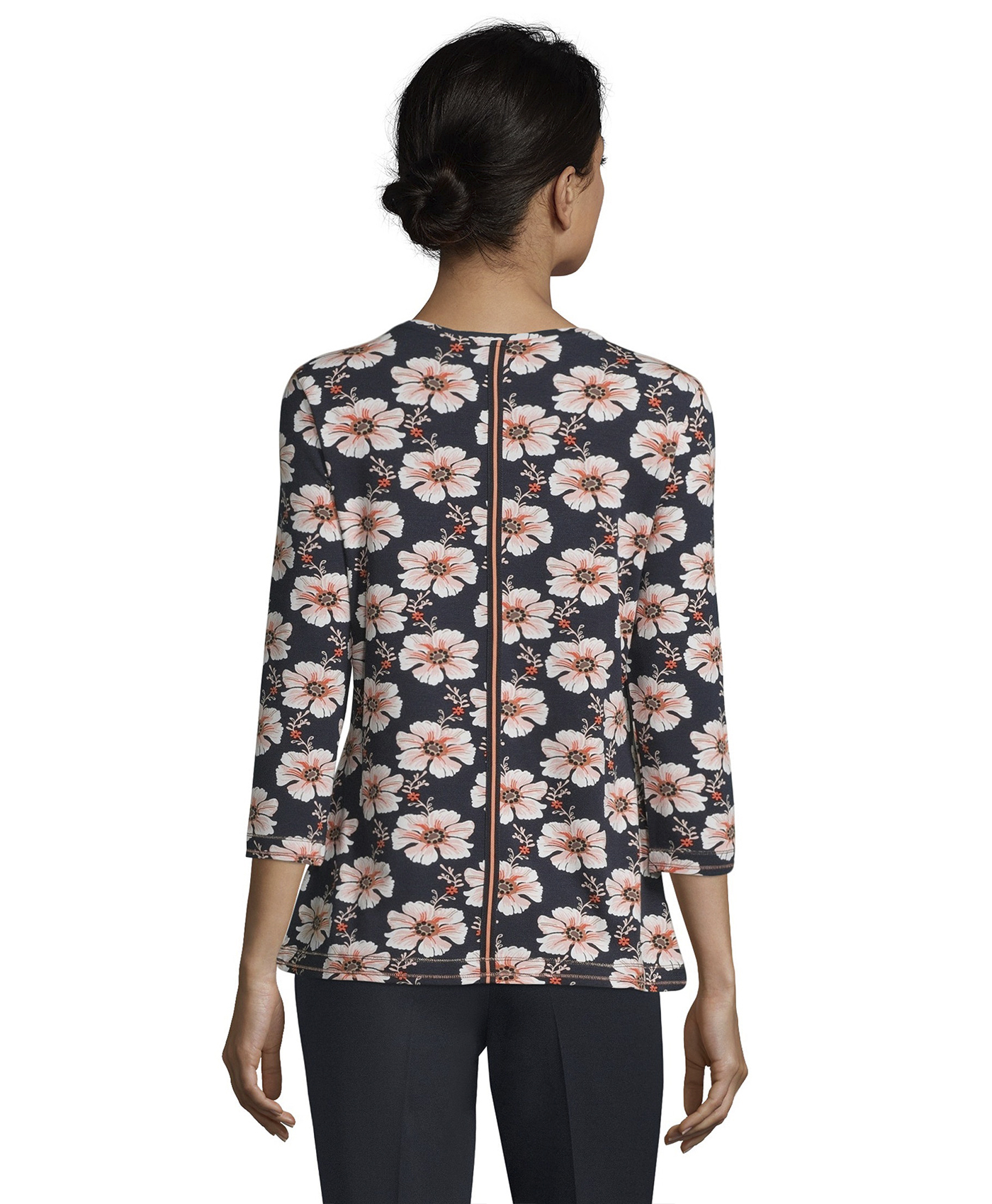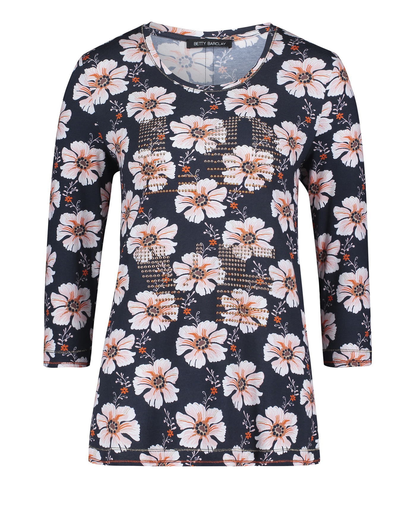 Цветочный принт в тренде! Футболка полуприлегающего силуэта с круглым вырезом горловины и рукавами 3/4. Стразы на груди придают блеск и гламур. Приятный к телу материал из смеси хлопка, модала и эластана обеспечивает комфорт. Эта футболка - отличный вариант верха для создания стильного повседневного образа.