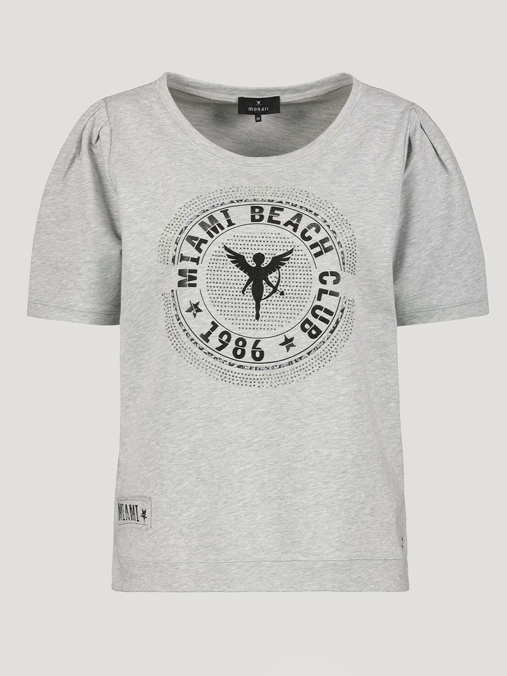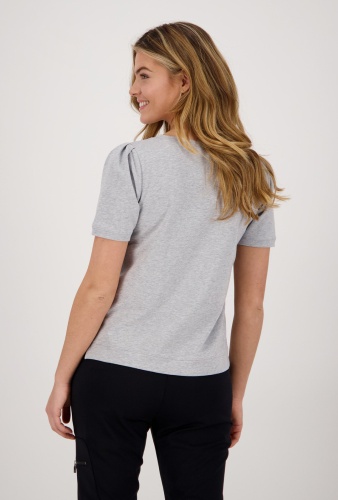 На сайте указаны Российские размеры. Серая однотонная футболка с принтом на переде изделия. Принт украшен стразами. Широкий овальный вырез горловины. Короткий втачной рукав со сборками.