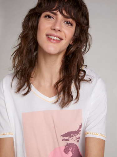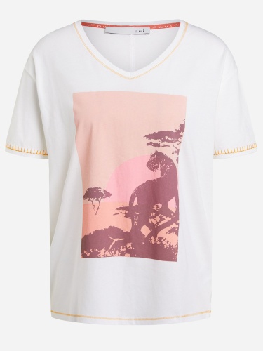 Белая футболка с анималистичным дизайном может быть самостоятельным верхом или надеваться под пиджак.V-образный вырез. Короткий втачной рукав, спущенная линия плеч.