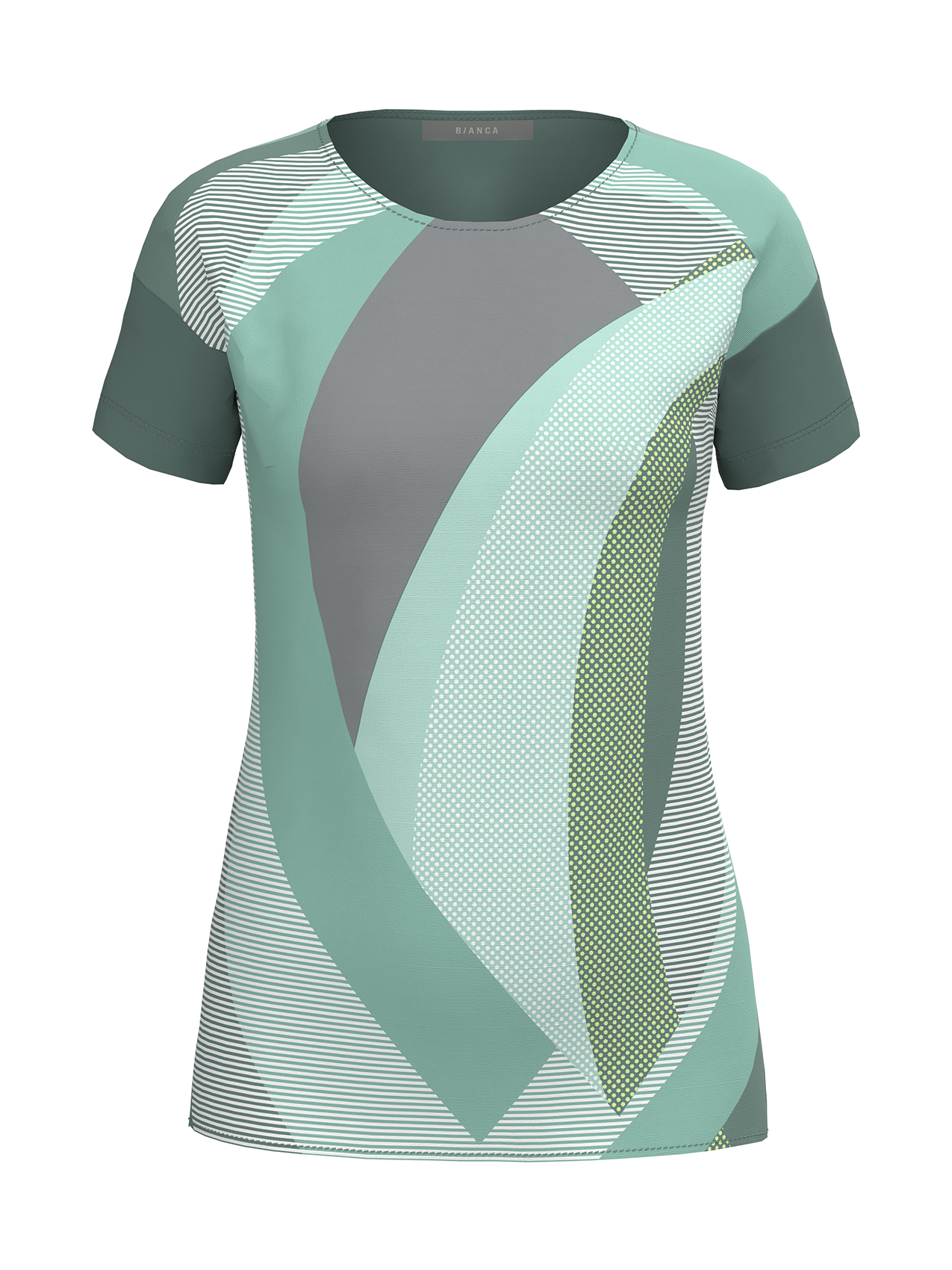 Футболка с геометрическим абстрактным узором на переде изделия выполнена в зеленых оттенках. Короткий втачной рукав, спущенная линия плеч. Широкий овальный вырез горловины.