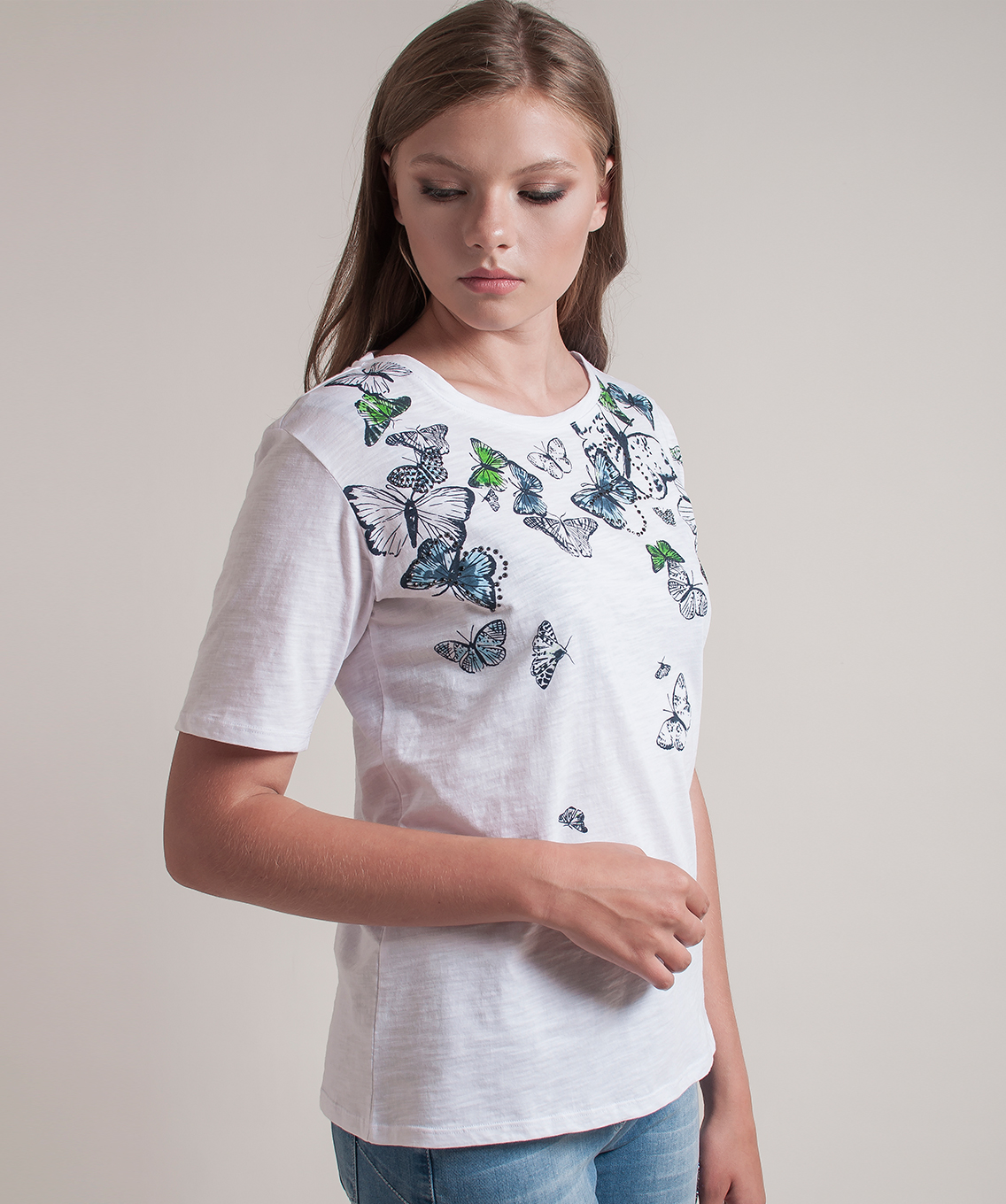 Футболка прямого покроя. Вырез горловины "лодочка". Принт с изображением бабочек подчеркивает нежный образ.