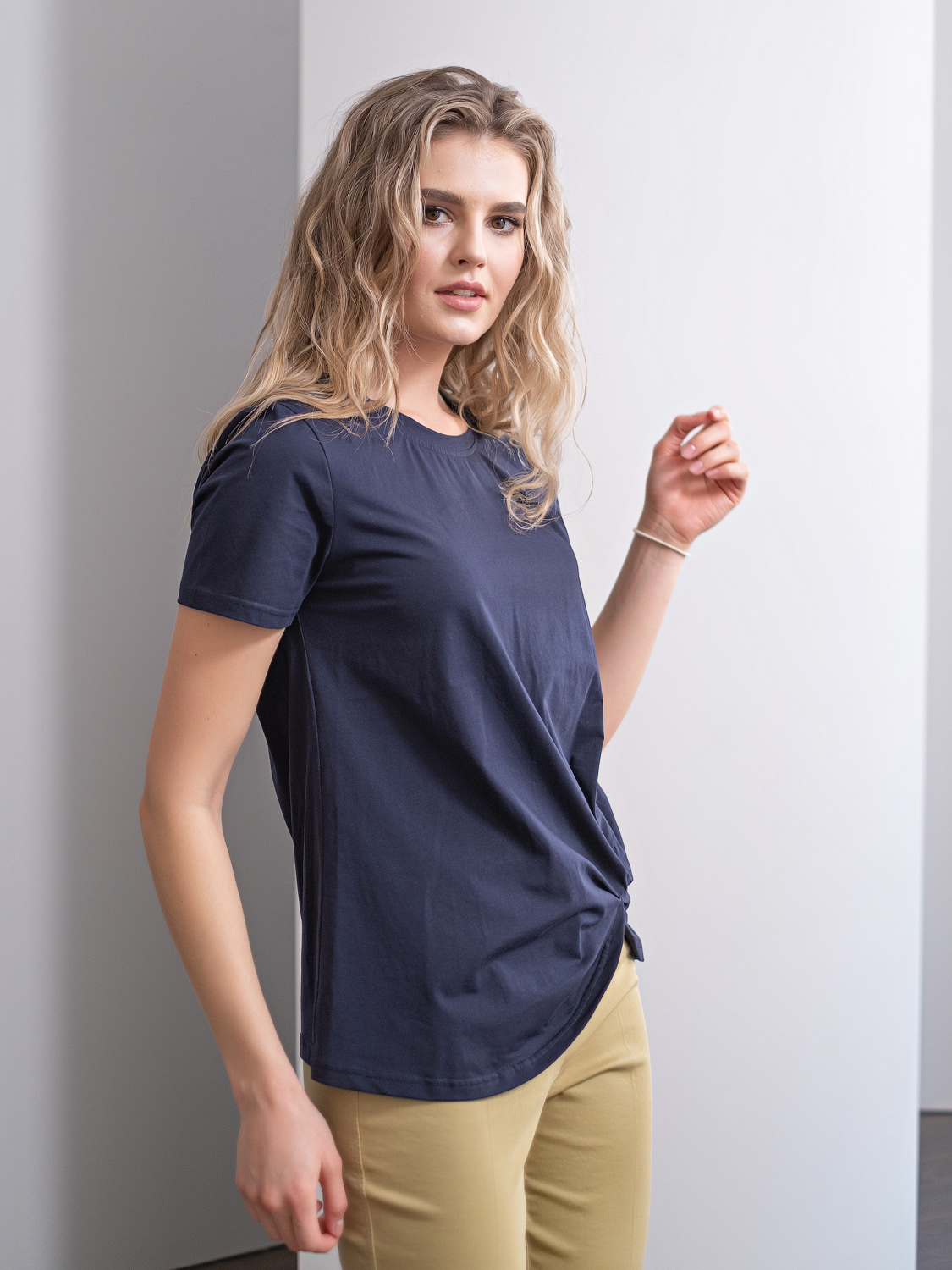 Ткань из натуральных материалов обеспечит комфорт и прохладу жарким летом. Круглый вырез горловины, декоративный элемент в виде фигурного узла и закругленный низ футболки создадут женственный образ. Данная модель будет хорошо сочетаться с брюками и с юбкой-карандашом.