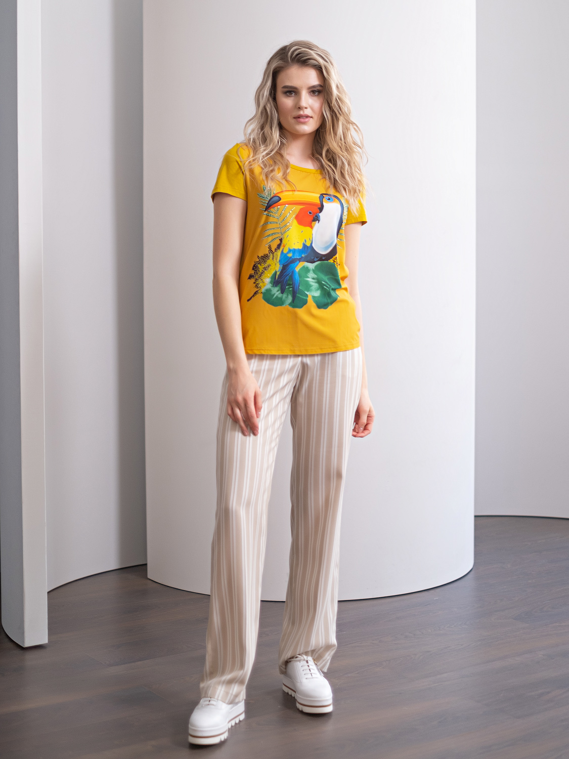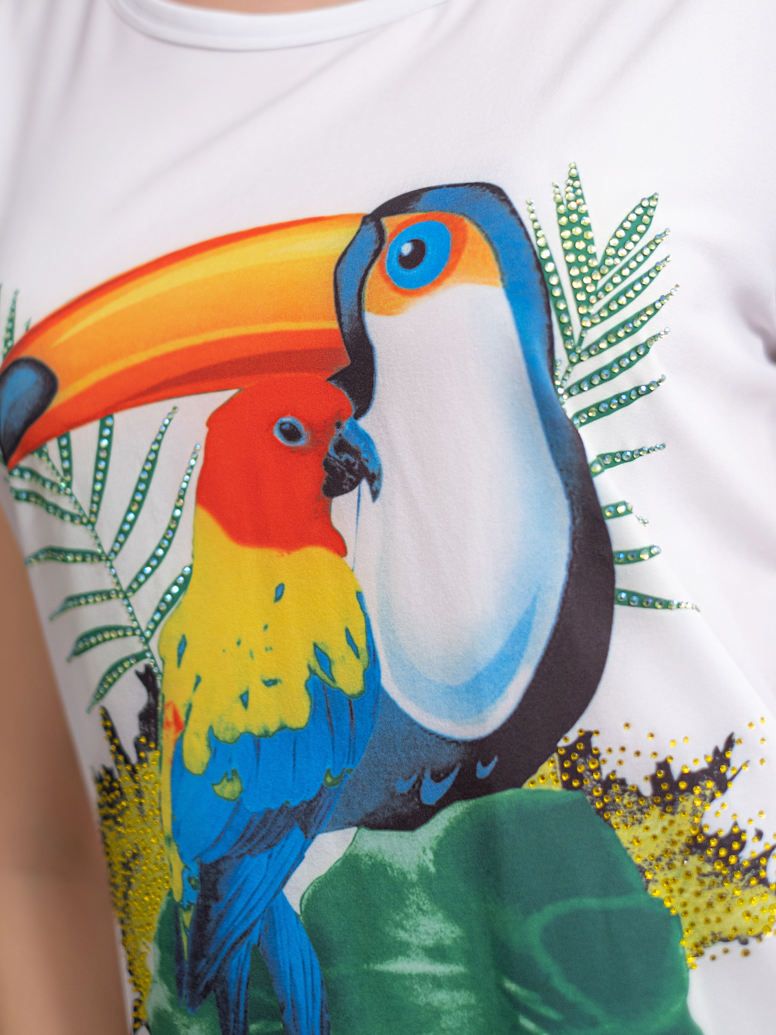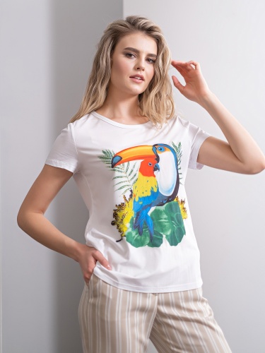 Футболка из приятной на ощупь ткани. Натуральные материалы в составе изделия обеспечат комфорт и прохладу жарким летом. Круглый вырез горловины создаст женственный образ. Посадка по фигуре. Модный в новом сезоне принт с тропическими птицами подчеркнет чувство вкуса обладательницы футболки. Данная модель будет прекрасно сочетаться как с брюками, так и с юбкой.