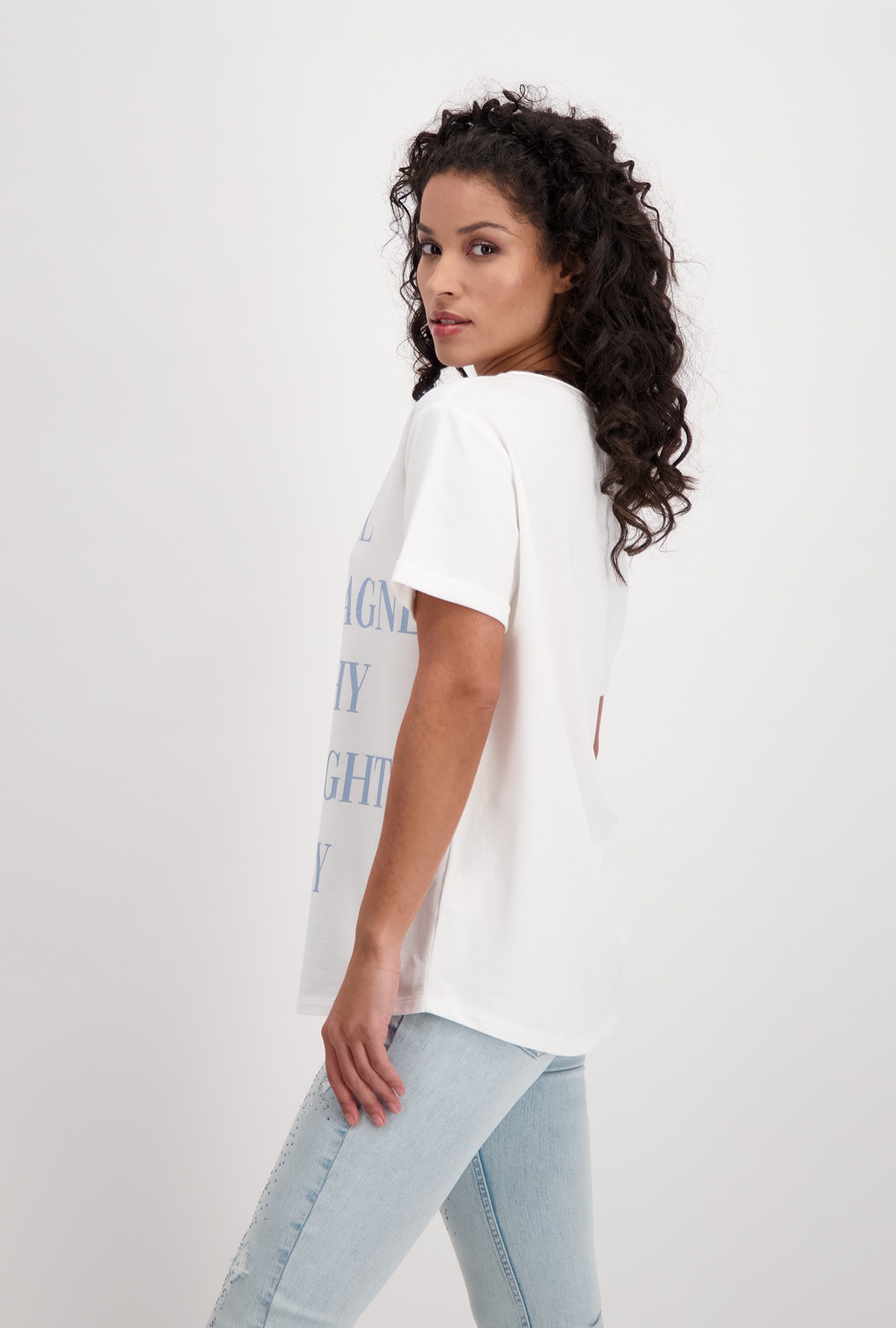 На сайте указаны Российские размеры. Футболка с короткими рукавами и круглым вырезом. На передней части футболки изображен крупный стильный текст. Прямой крой с подвернутыми концами рукавов, круглый вырез горловины с подвернутым краем и блестящим оверлочным швом с люрексом, а также удлиненная спина с закругленным низом. Параметры модели: 42 размер, рост 174 см