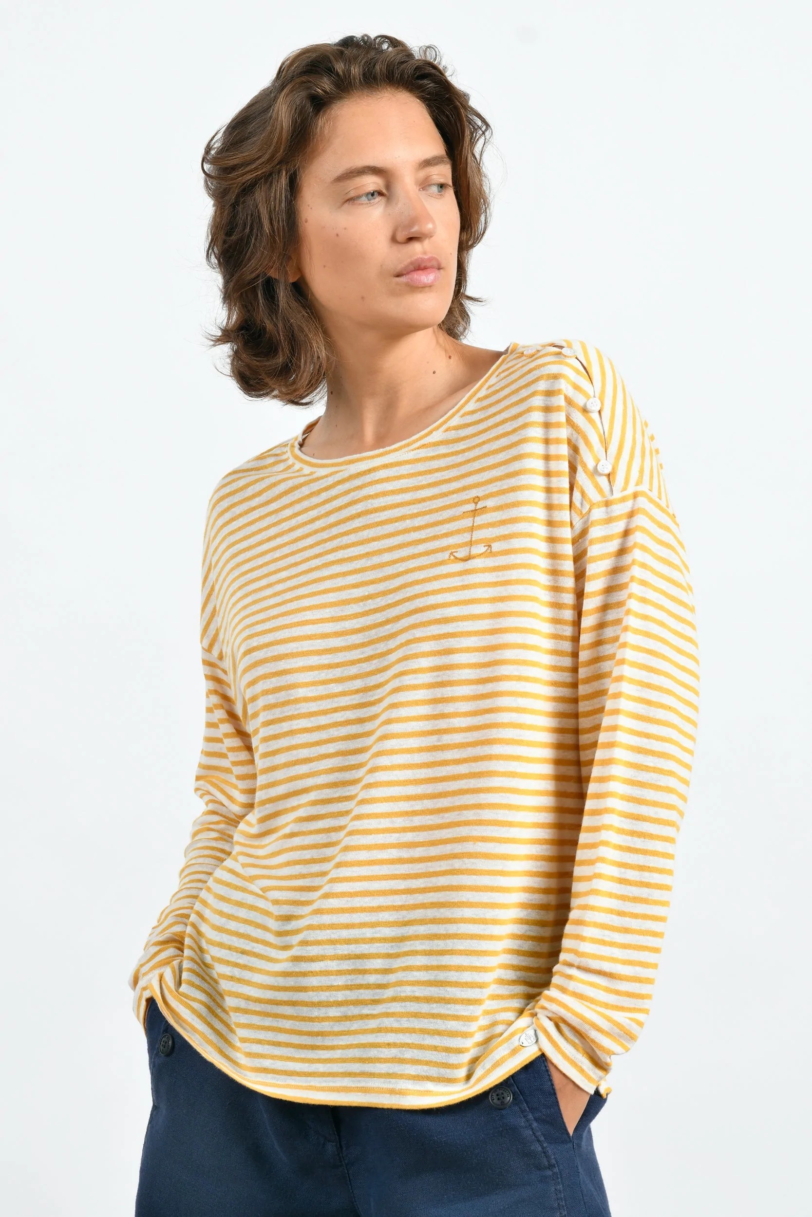 На сайте указаны Российские размеры. Футболка прямого кроя с длинными рукавами и спущенными плечами. Вышивка якоря на груди. На левом плече нарядная застежка с перламутровыми пуговицами. Круглый воротник. Небольшие разрезы по низу изделия.
