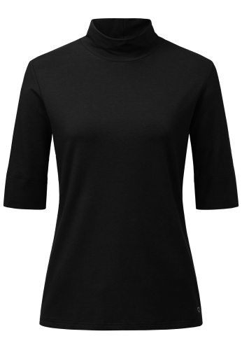 На сайте указаны российские размеры. Черная водолазка с модными короткими рукавами — актуальная комбинация для модных образов осенью и зимой. Рубашку можно носить с повседневным кардиганом или элегантно сочетать со стильным блейзером . Благодаря сочетанию комфортного эластана и высококачественного хлопка приталенная рубашка с короткими рукавами и водолазкой особенно удобна в носке. Кроме того, приталенный крой рубашки с высоким воротником создает красивую фигуру. Особое внимание привлекает маленькое сердечко из сверкающих серебряных стразов на подоле. Наша модель ростом 177 см. Измерения для размера 44: Окружность груди: 92 см Талия: 88 см Бедра: 97 см Длина по спинке: 62 см. Длина рукава: 31 см.