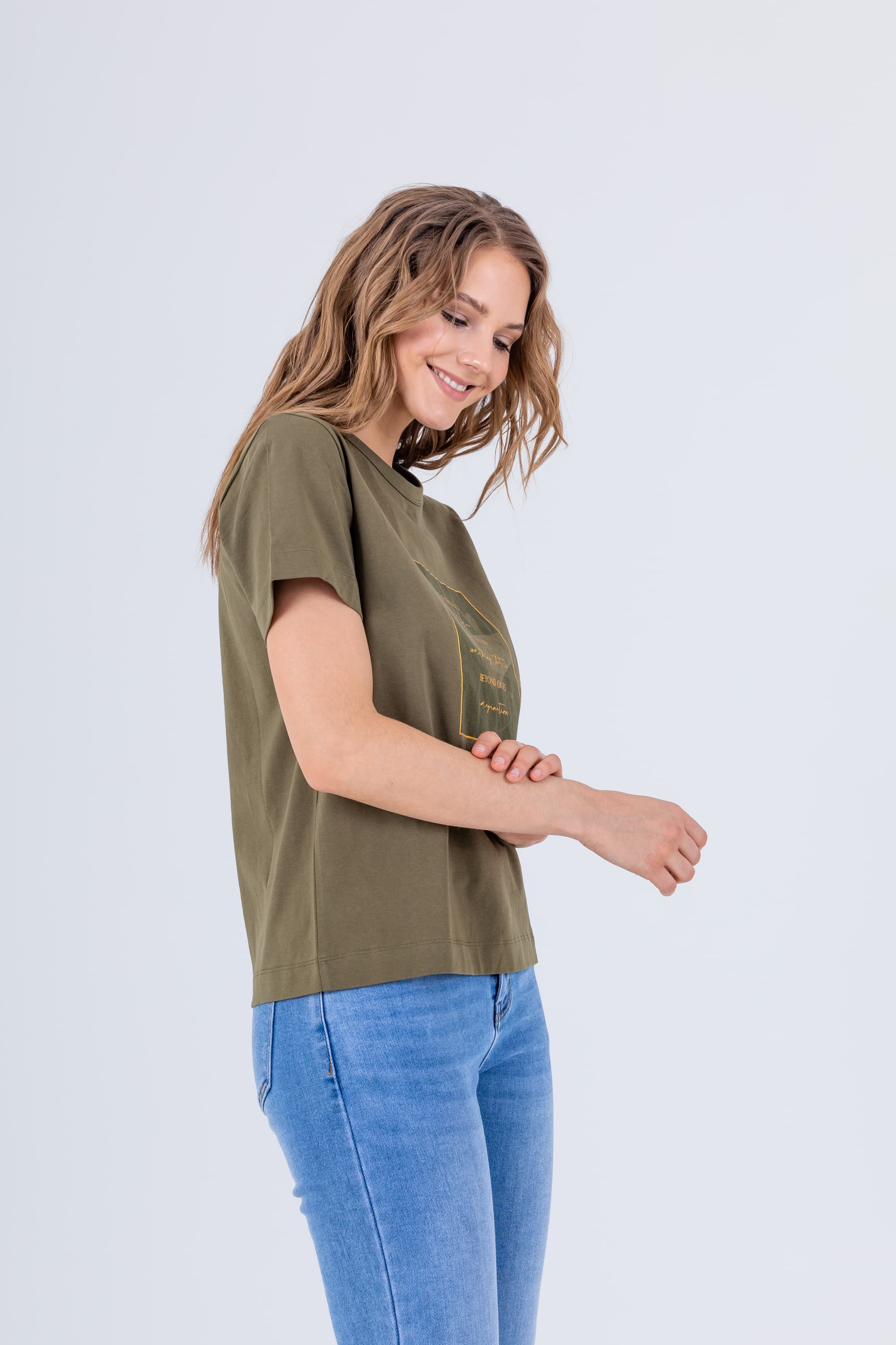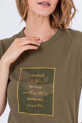 На сайте указаны российские размеры. Футболка средней длины прямого силуэта из легкого 100% хлопка. По переду выполнен растительный принт с надписями. Укороченные втачные рукава. Круглый вырез горловины.