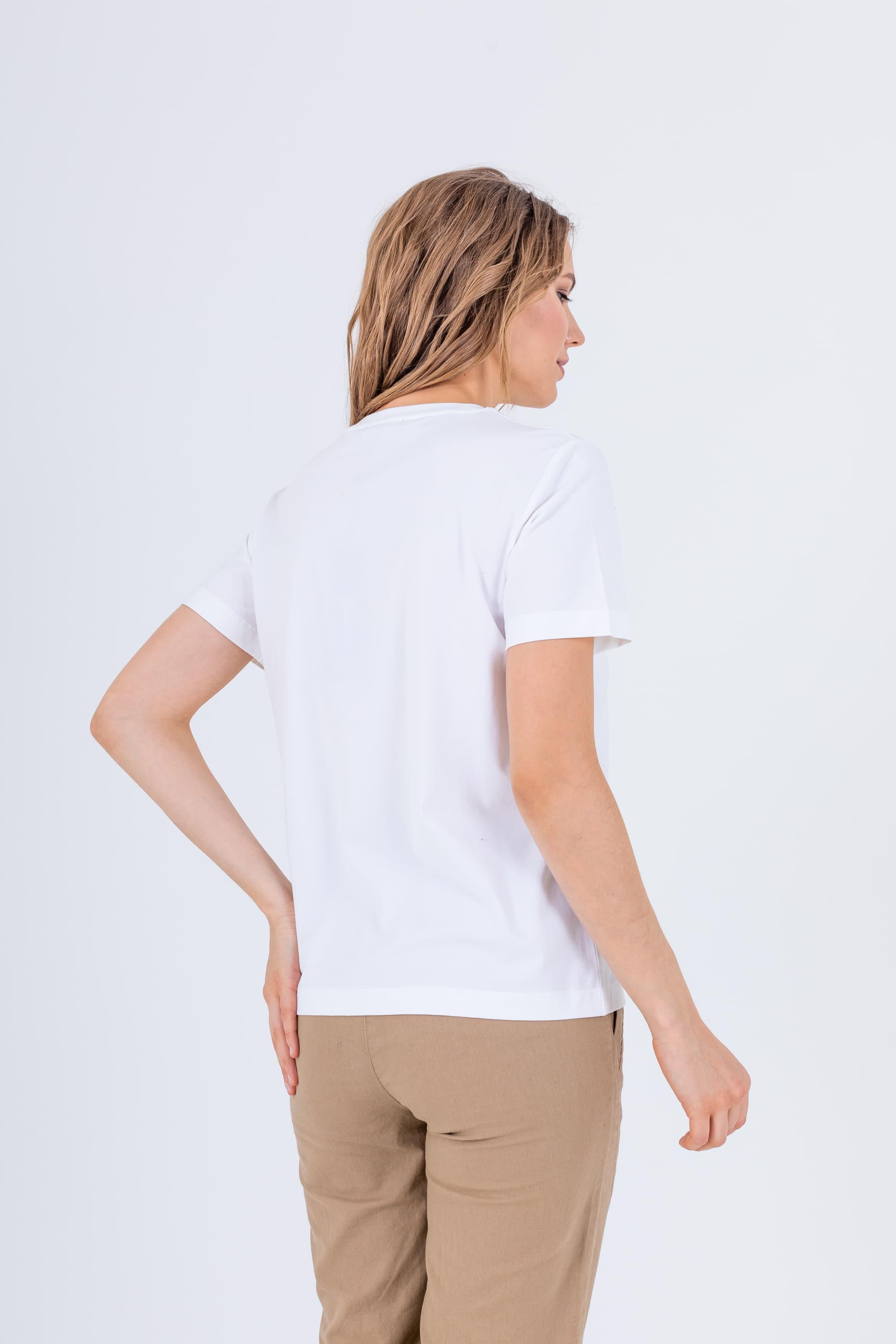 Яркая футболка средней длины прямого силуэта из легкого хлопка, мягкой вискозы и с добавлением эластана. Укороченные втачные рукава. Круглый вырез горловины.