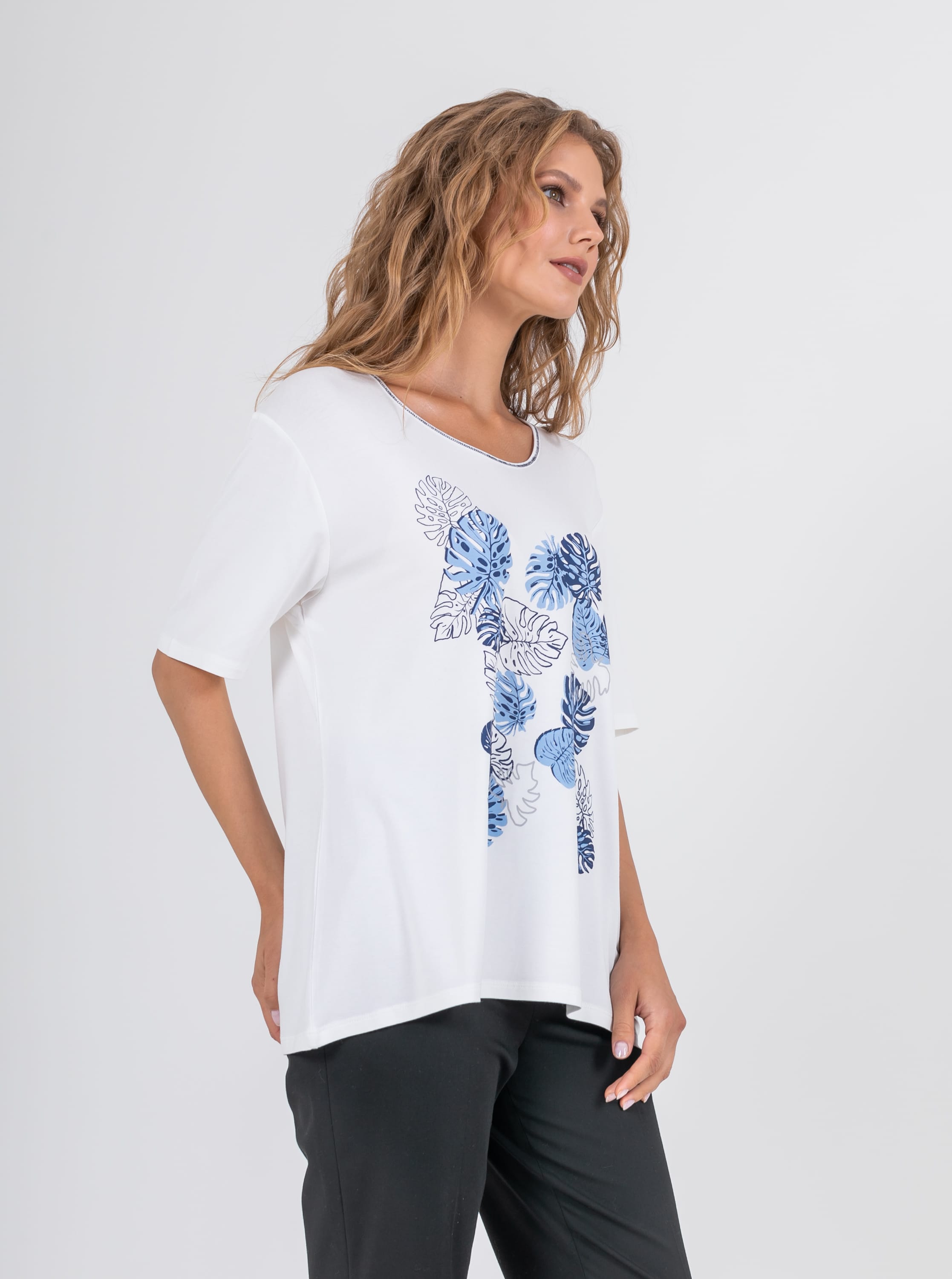 На сайте указаны российские размеры. Ткань: изготовлена из высококачественной вискозы (92%) – экологичного материала, хорошо пропускающего воздух и впитывающего излишки влаги, и эластана (8%), придающего ткани упругость. Крой: футболка удлиненная прямого силуэта с коротким свободным рукавом-регланом. Классическая модель с круглым вырезом – база, которая прекрасно смотрится на женщинах разного роста и комплекций. Обеспечивает максимальный комфорт, прекрасно садится по фигуре. Отделка: футболку украшает стильный принт с актуальными уже несколько сезонов монстерами. Вырез обрамляет контрастная синяя строчка-зигзаг, добавляющая образу оригинальности.