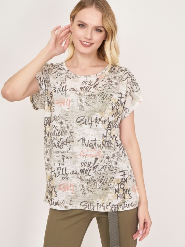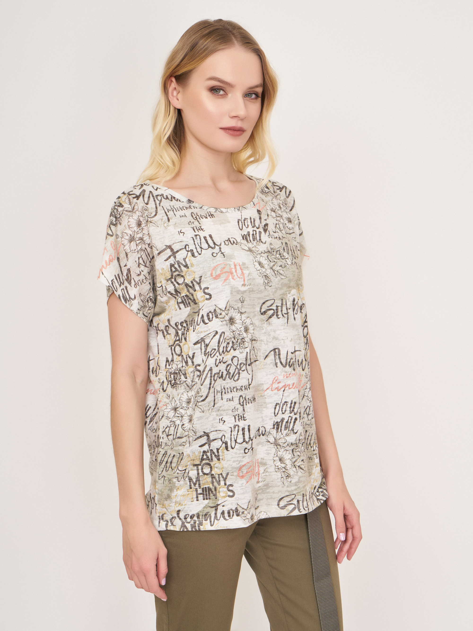 На сайте указаны российские размеры. Прямой трикотажный хаки джемпер-футболка с круглым вырезом, с коротким рукавом, с цветочным рисунком, с надписями. Длина по спинке: 64 см. Рост модели: 176 см.