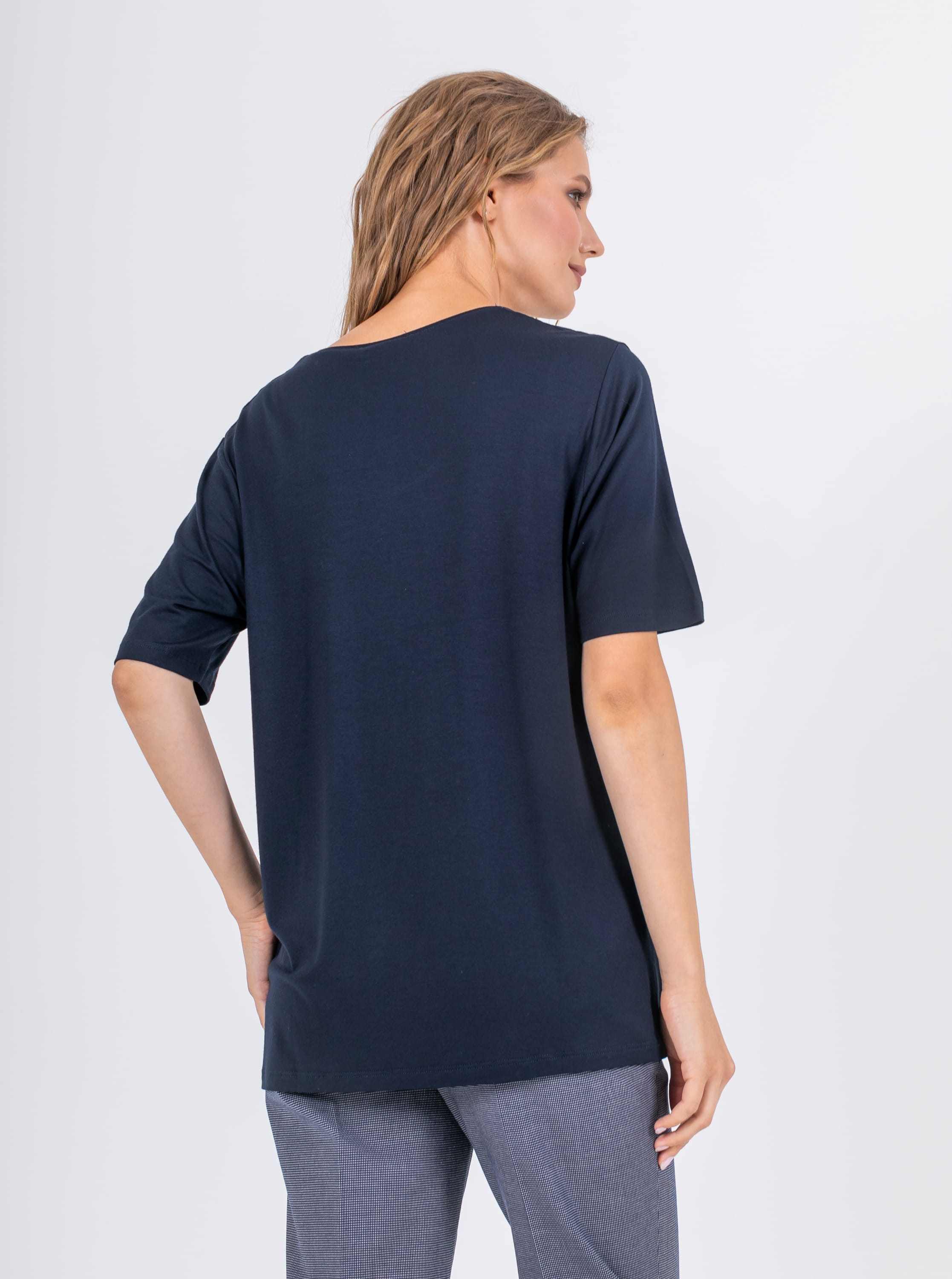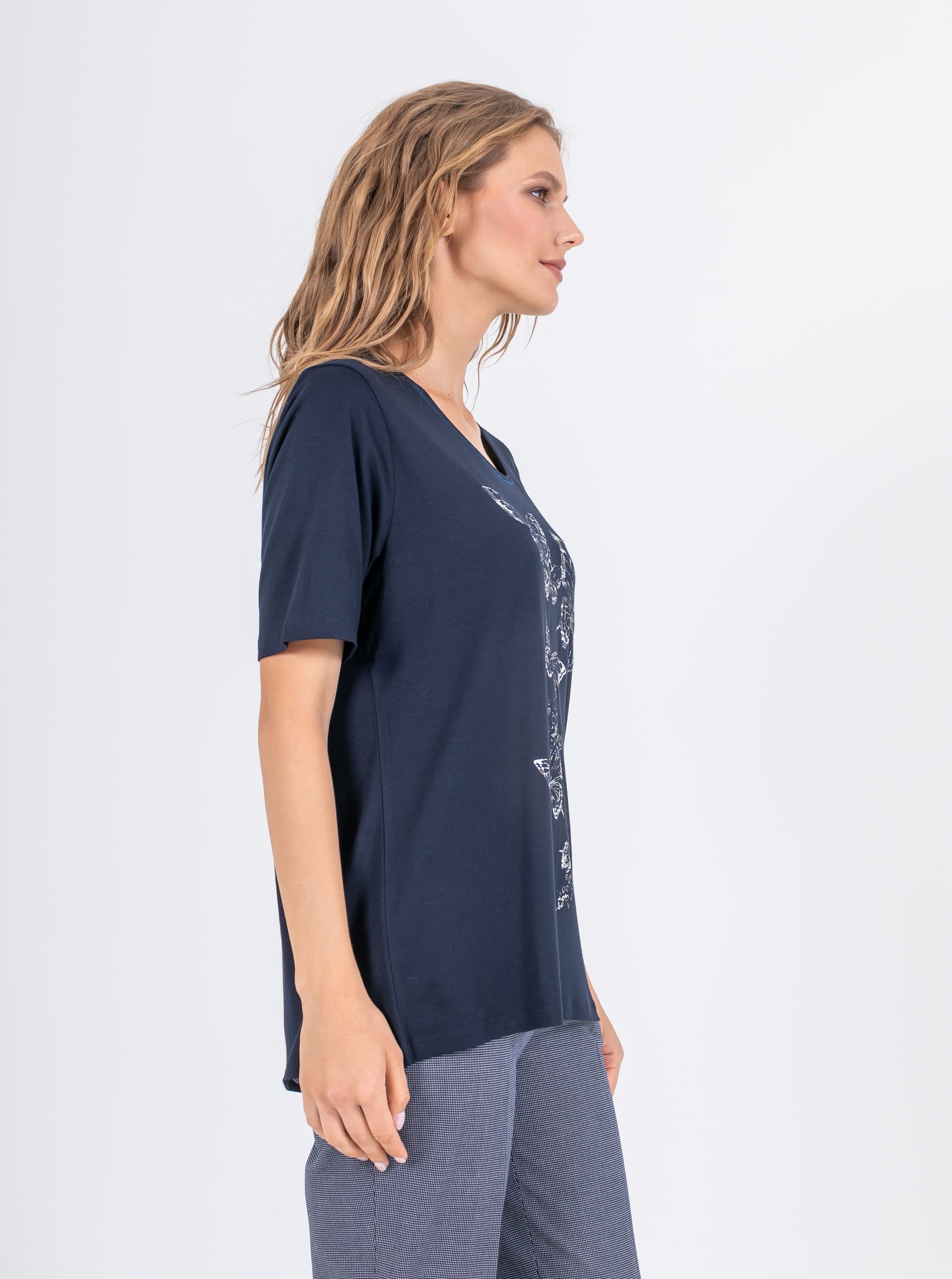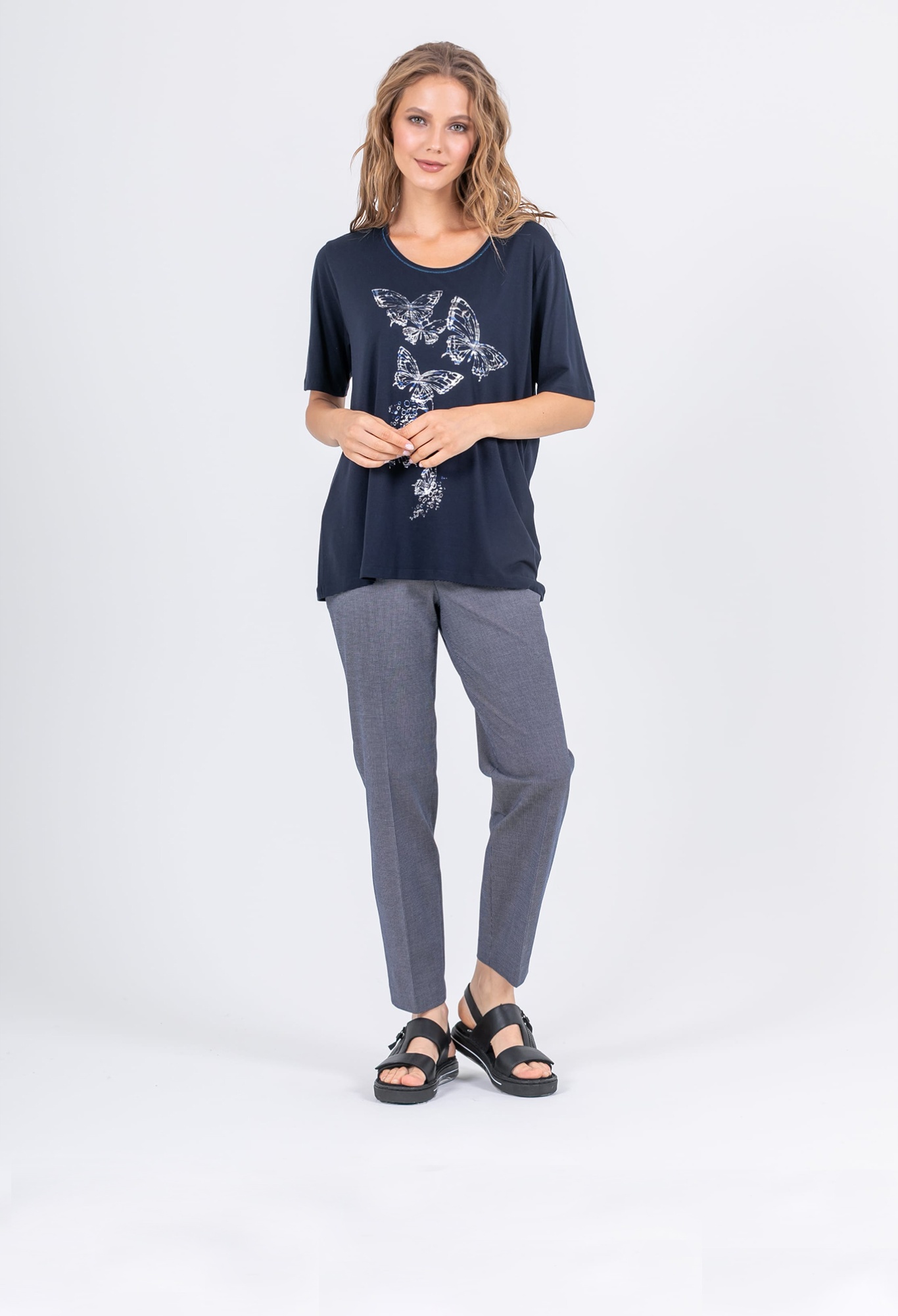 На сайте указаны российские размеры. Длинная футболка прямого силуэта из легкой, мягкой вискозы с добавлением эластана. По переду выполнен яркий принт в виде белых бабочек. Укороченные втачные рукава. Круглый вырез горловины с отделочной строчкой по переду.