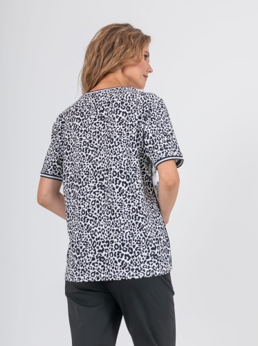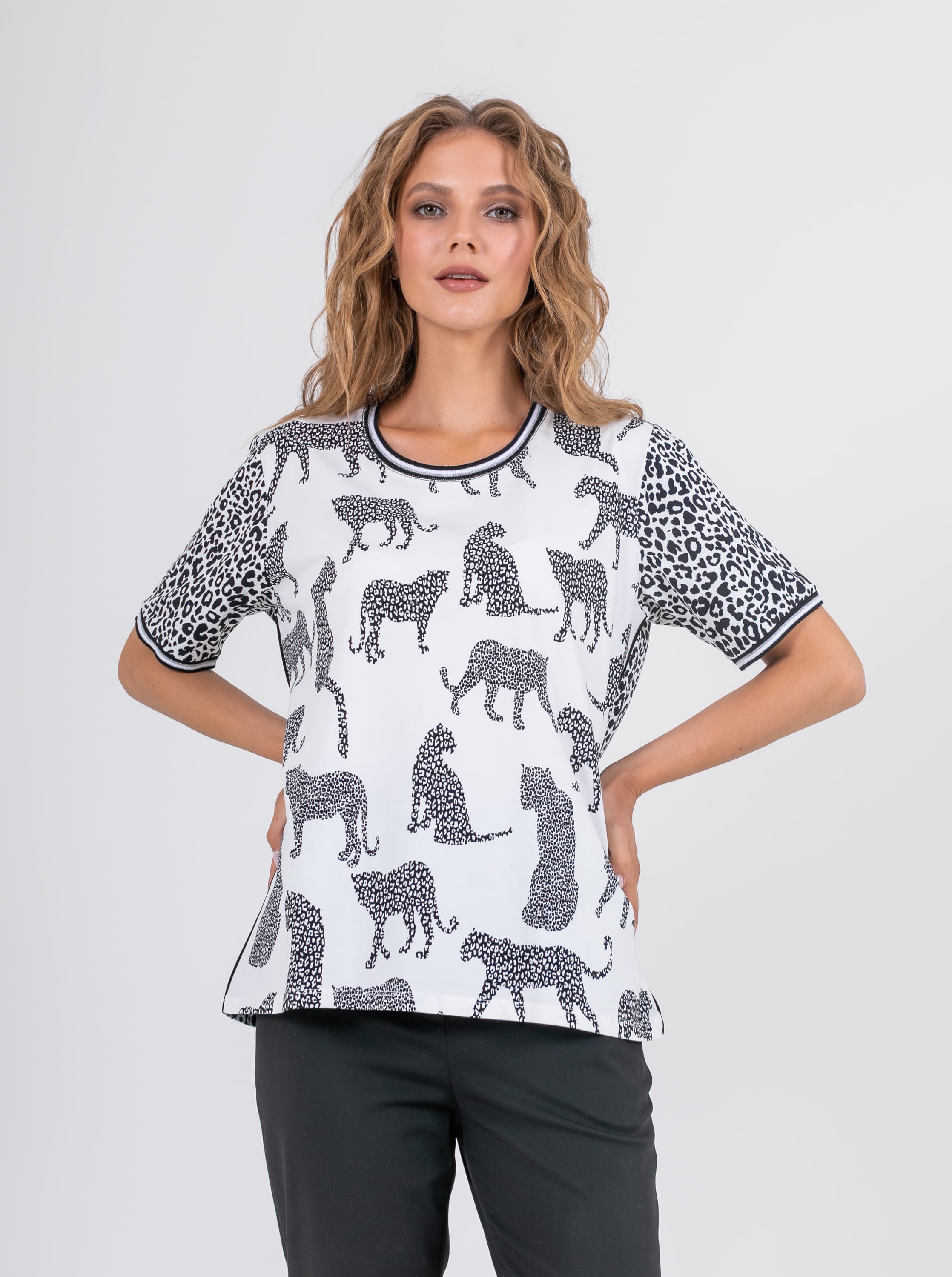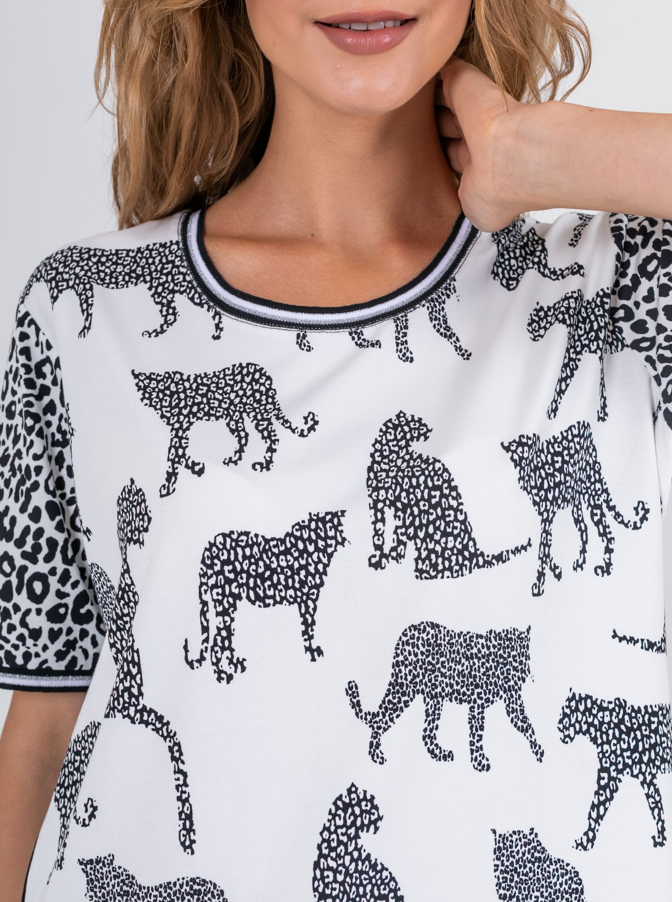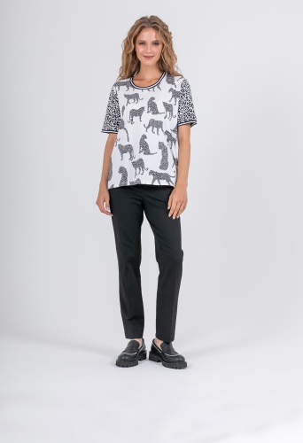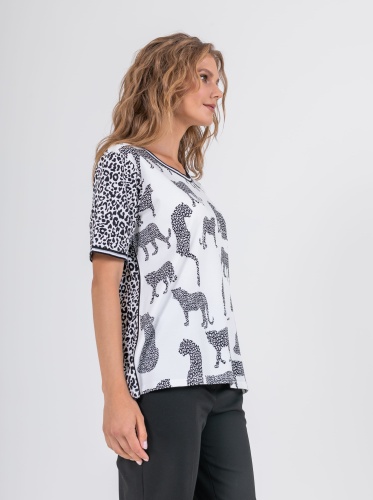 На сайте указаны российские размеры. Ткань: выполнена из высококачественного хлопка с добавлением эластана (95% хлопок, 5%эластан) Крой: футболка прямого силуэта с коротким рукавом-регланом. Базовая модель с круглым вырезом подходит под разные типы фигур, выгодно подчеркивает достоинства фигуры и скрывает возможные недостатки благодаря неполному прилеганию к телу. Отделка: ультрастильную футболку украшают два разных принта: по корпусу – принт с хищными кошками, на рукавах – классический леопардовый. По горловине и низу рукава пущен эластичный кант с легким блеском, благодаря которому футболка лучше фиксируется на теле.