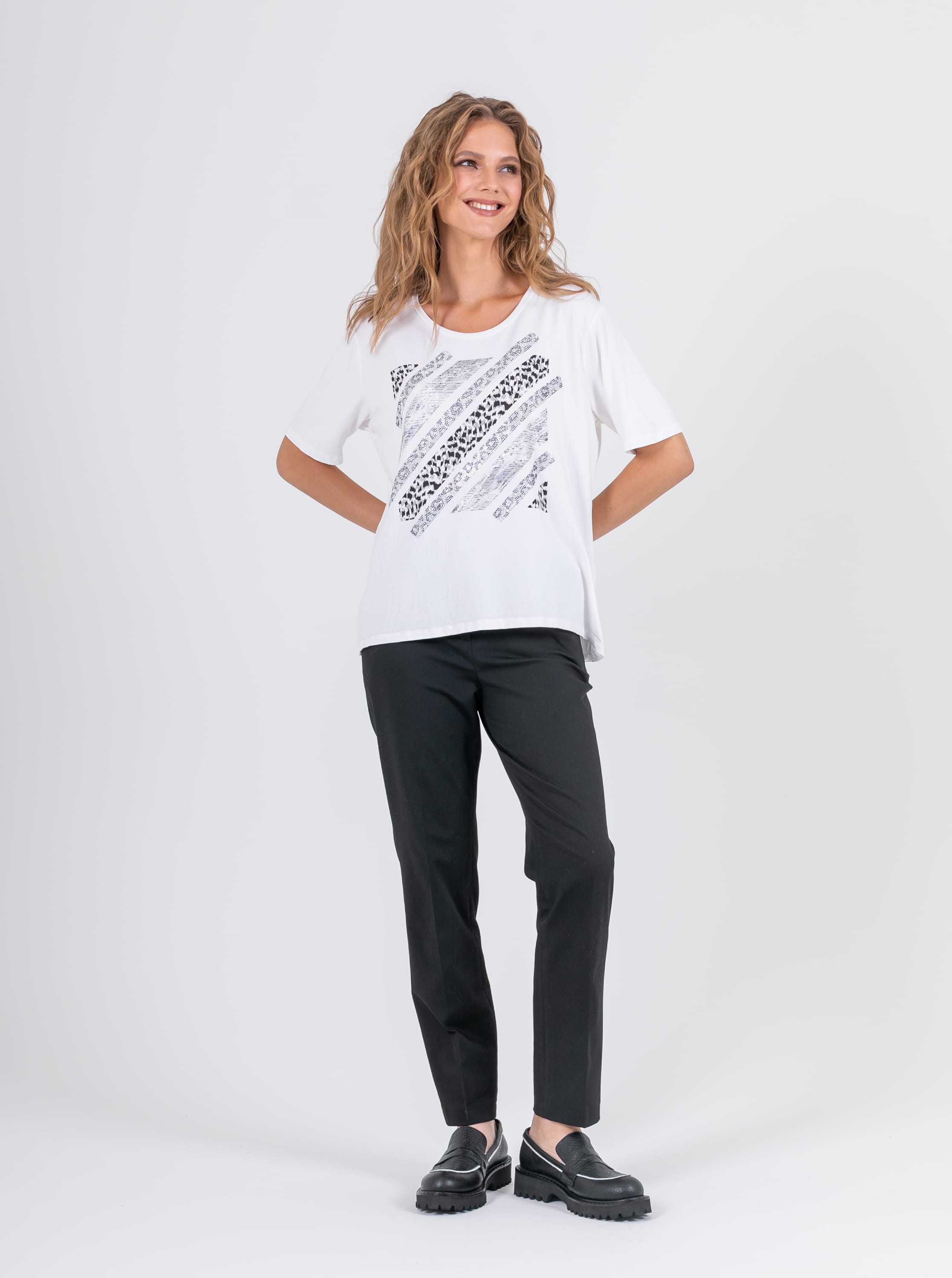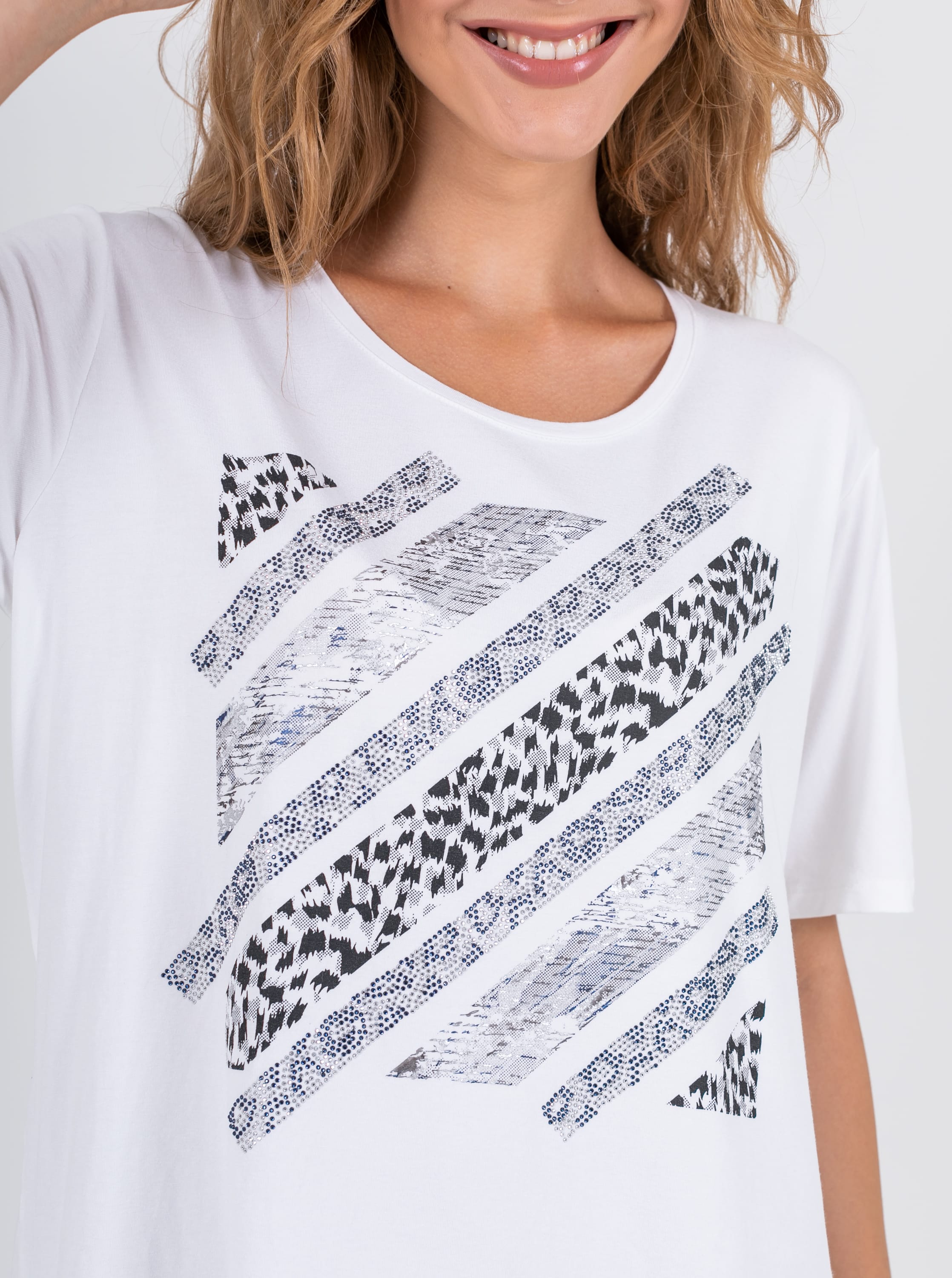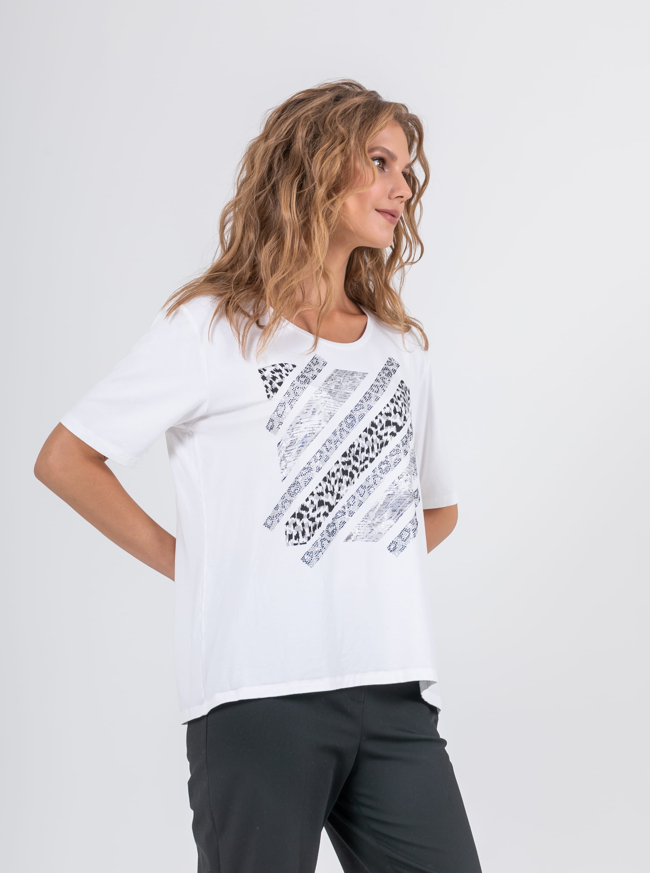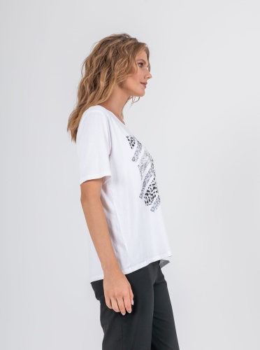 На сайте указаны российские размеры. Ткань: изготовлена из высококачественной вискозы (92%) – экологичного материала, хорошо пропускающего воздух и впитывающего излишки влаги, и эластана (8%), придающего ткани упругость. Крой: футболка средней длины свободного силуэта. Имеет круглый вырез и свободные рукава-регланы, которые дарят максимум свободы и комфорта. Белый цвет футболки освежает, делает образ легким и современным. Отделка: украшена принтом с животными мотивами. Часть композиции составляют усыпанные стразами элементы, добавляющие изделию торжественности и блеска.