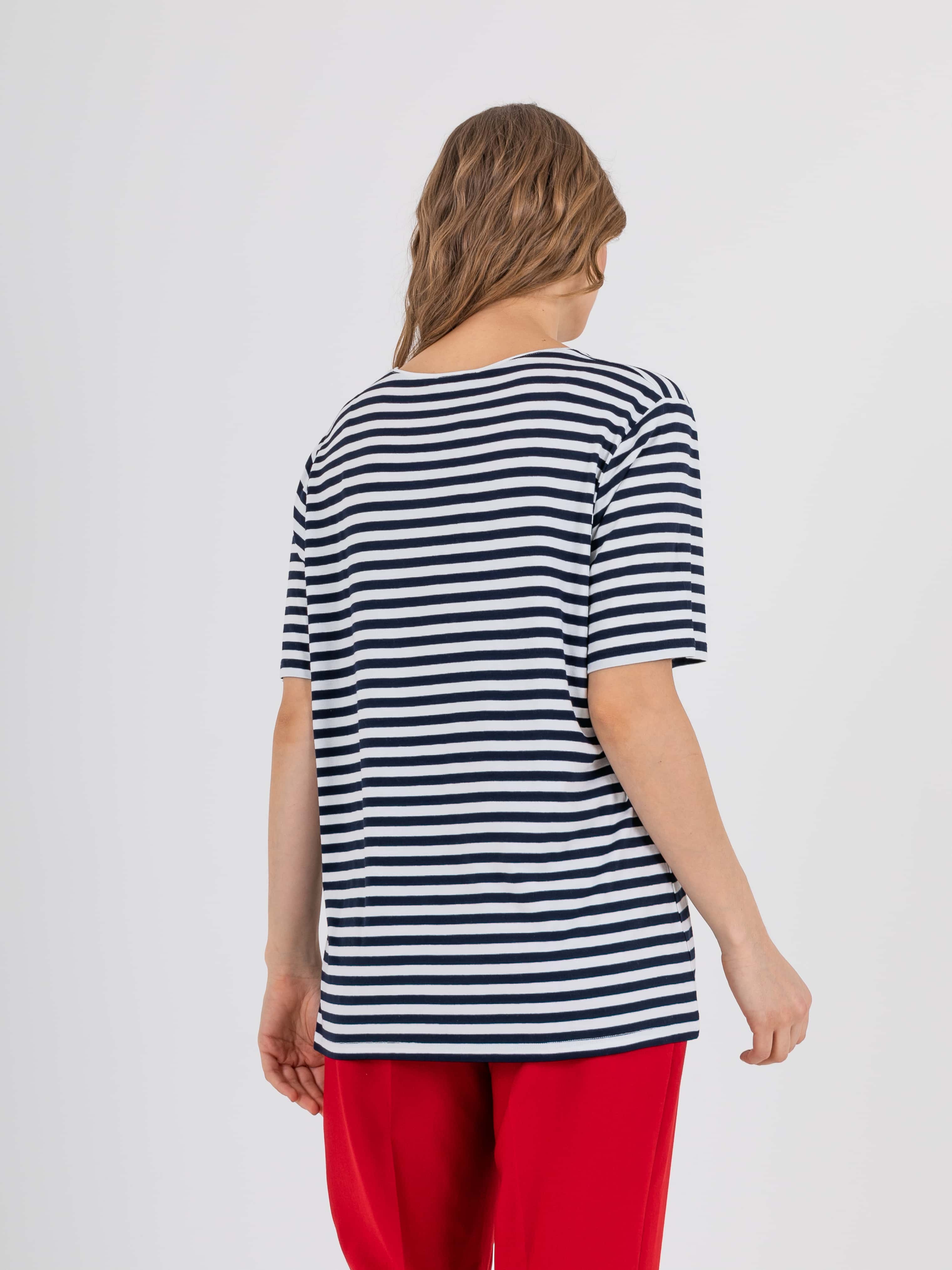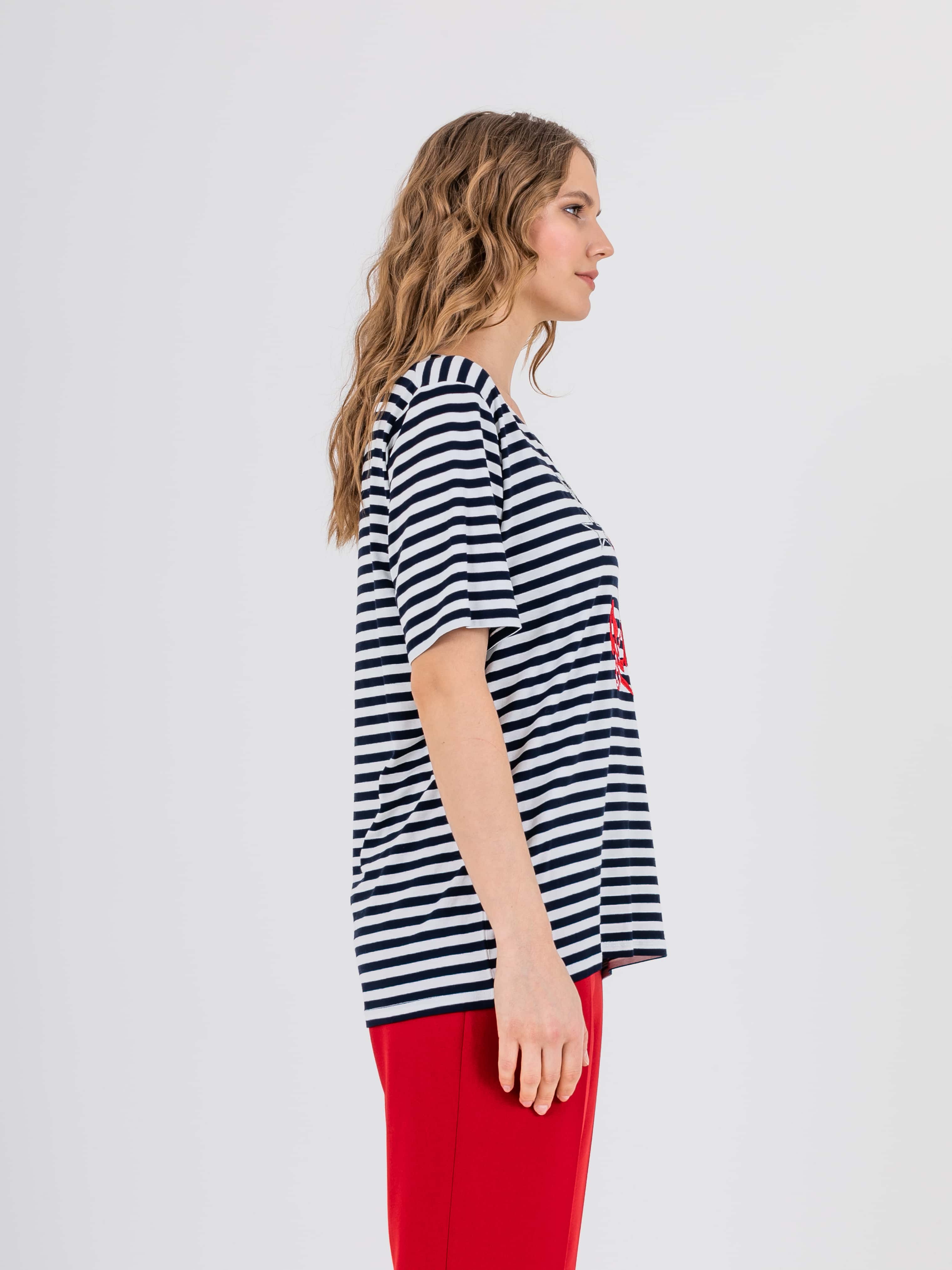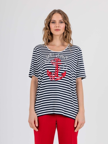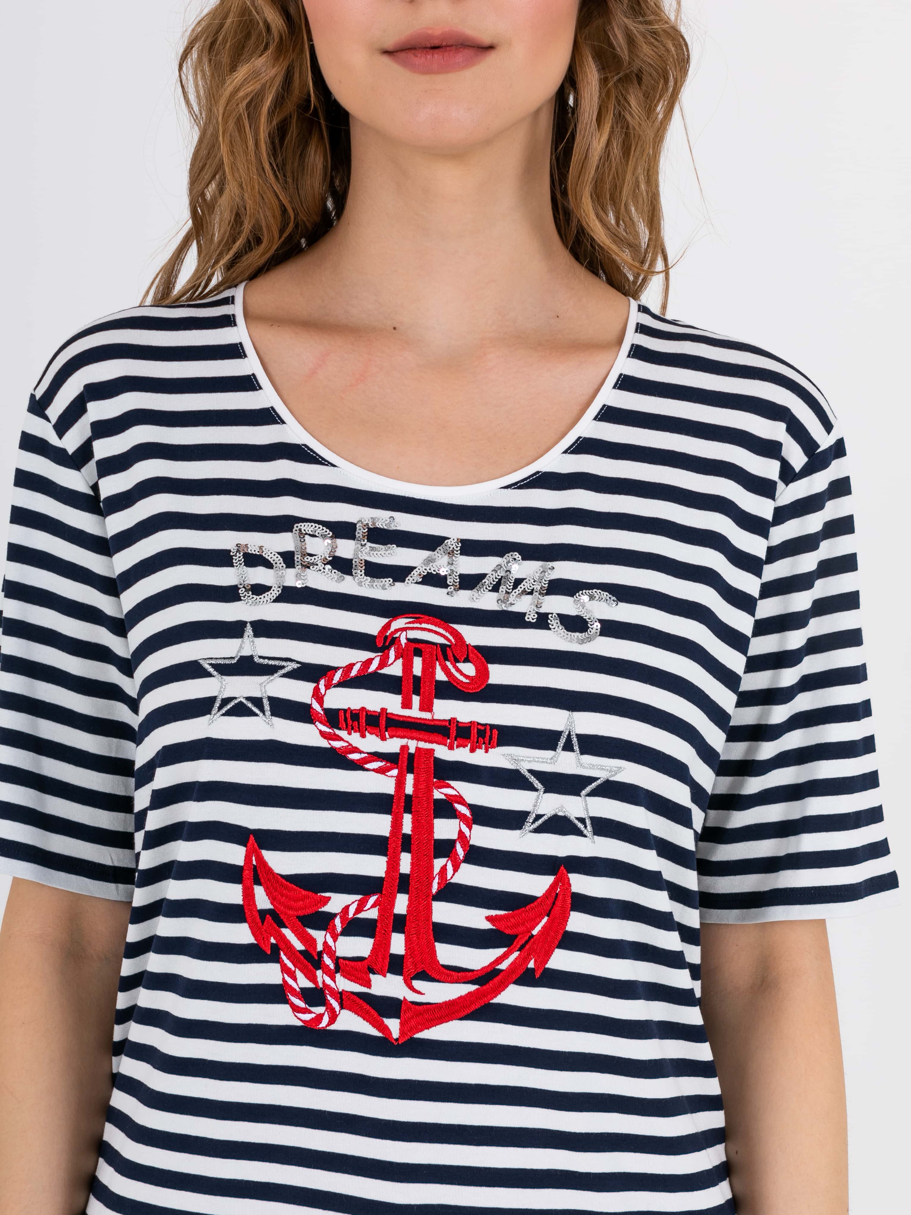 На сайте указаны российские размеры. Ткань: изготовлена из высококачественной вискозы (92%) – экологичного материала, хорошо пропускающего воздух и впитывающего излишки влаги, и эластана (8%), придающего ткани упругость. Крой: классическая футболка-тельняшка с круглым вырезом и свободным коротким рукавом-регланом. Имеет достаточную длину, закрывает область живота, не поднимается вверх при движении и поднятии рук. Футболку можно заправить или носить навыпуск. Отделка: футболку украшает композиция из декоративных элементов: надпись «dream» выполнена из серебристых пайеток, а яркий морской якорь и звезды вышиты атласными нитями.