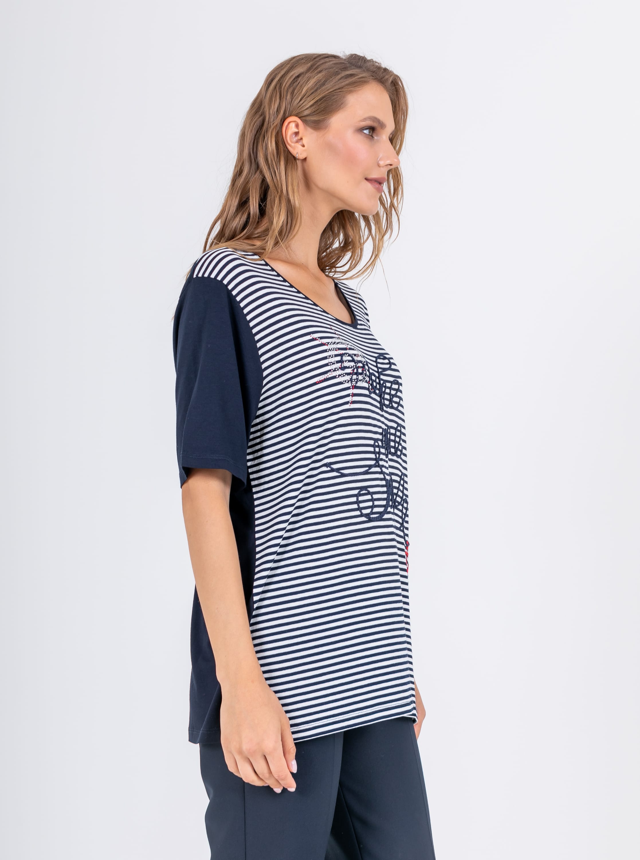 На сайте указаны российские размеры. Ткань: изготовлена из высококачественной вискозы (92%) – экологичного материала, хорошо пропускающего воздух и впитывающего излишки влаги, и эластана (8%), придающего ткани упругость. Крой: удлиненная футболка прямого силуэта с круглой горловиной и свободным рукавом-регланом. Дарит комфорт и свободу движения, без скованности. Полностью не прилегает к телу, а значит, не подчеркивает возможные нюансы фигуры, о которых не нужно знать всем. Отделка: спинка и рукава – однотонные, передняя часть футболки – из полосатой ткани, на которой вышит текст и яркий красный якорь, напоминающие об отдыхе на море. Футболка также украшена элементом из страз, которым не страшны многочисленные циклы стирок.