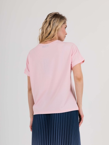 На сайте указаны российские размеры. Футболка средней длины прямого силуэта из легкой, мягкой вискозы с добавлением эластана. По переду выполнен цветочный принт, дополненный стразами. На спинке выполнена аппликация из страз. Короткие цельнокроеные рукава. Круглый вырез горловины, обработан отделочной строчкой.