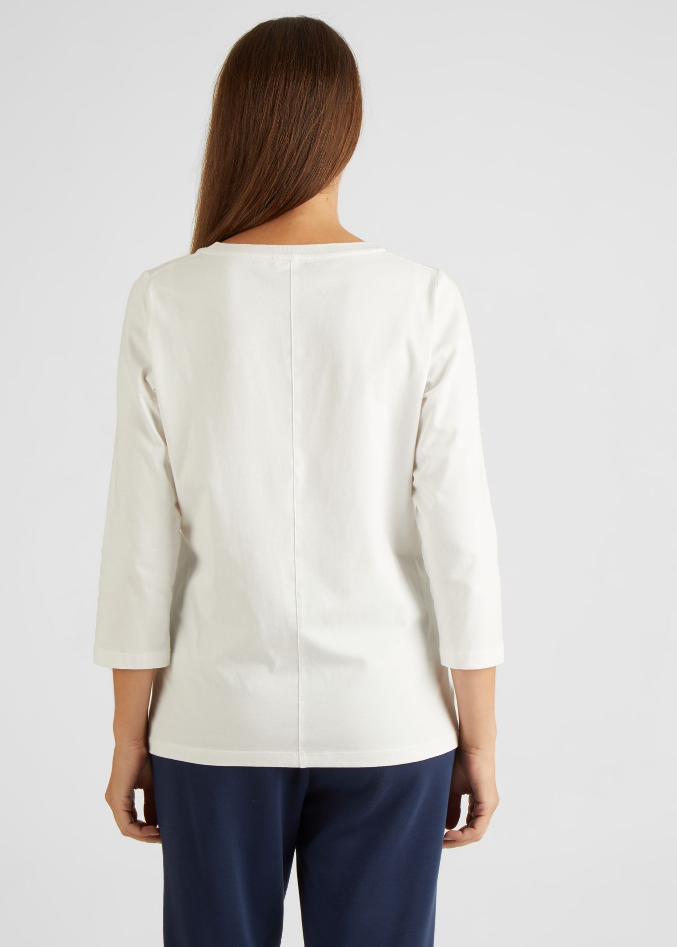 На сайте указаны российские размеры. Однотонная рубашка с рукавами 3/4 и очаровательным принтом спереди и аппликацией из страз привлекает внимание. Качество мягкого трикотажа и хлопка гарантирует удобную посадку. Сочетайте эту рубашку с джинсами или небрежно с спортивными брюками. Рост модели 176 см. Длина по спинке от плеча для размера 46: 64 см.
