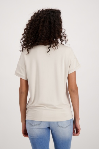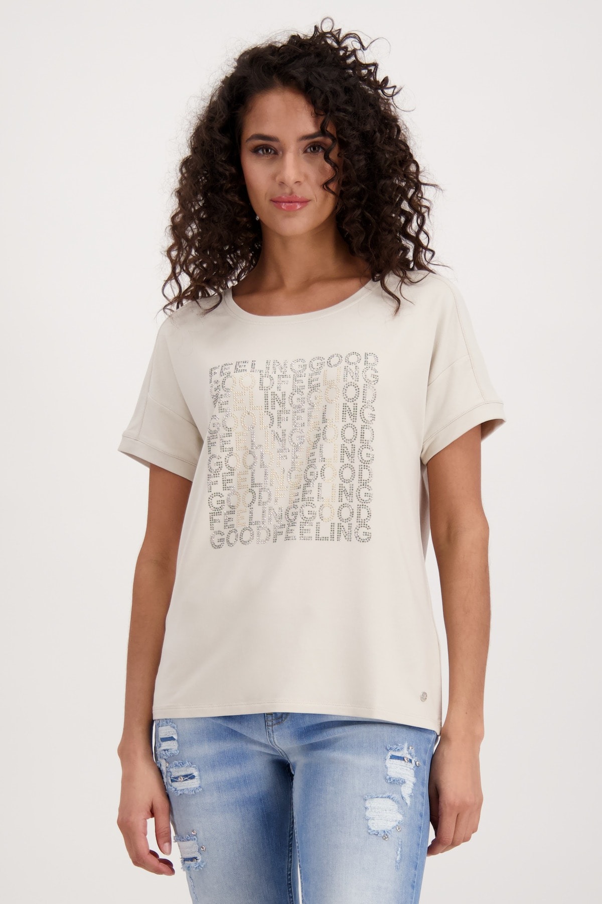 На сайте указаны российские размеры. Футболка со сверкающей надписью из страз привлекает всеобщее внимание. Покрой вдохновляет на классический крой с круглым вырезом горловины, полурукавами и манжетами на кромке рукава. Верх с блестками — всегда лучший выбор, он умело украсит любой наряд в стиле смарт-кэжуал. Длина в размере 44: 64 см. Рост модели 177 см.