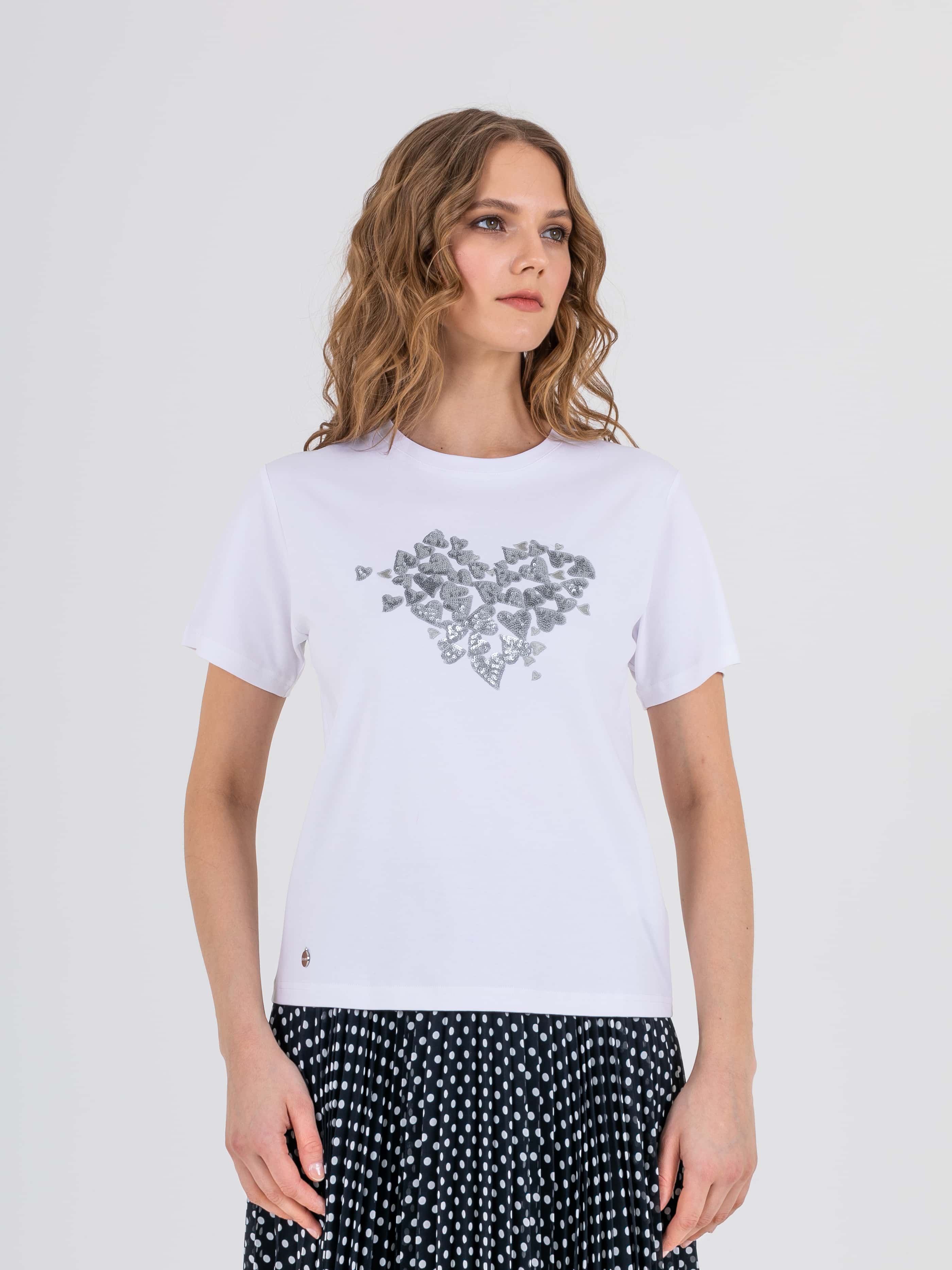 Футболка средней длины прямого силуэта из легкого хлопка. По переду выполнена нежная вышивка пайетками. Укороченные втачные рукава. Круглый вырез горловины.
